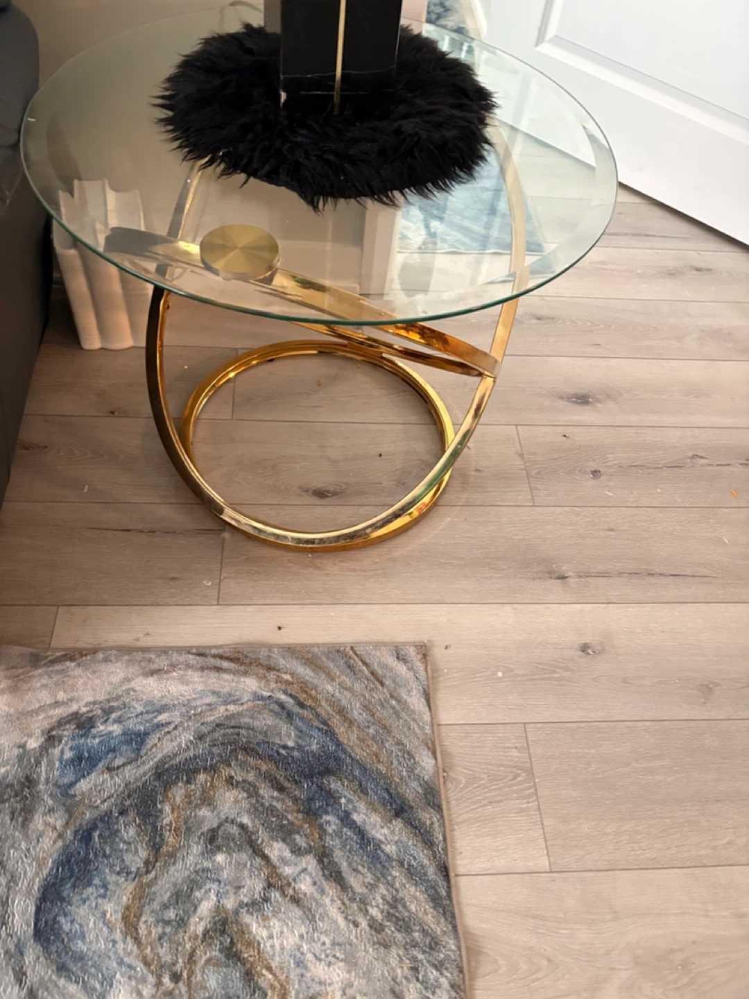 This stylish accent table features a clear glass top and a unique gold metal base with a swirling design. It's a great addition to any living space, offering a touch of modern elegance. The sturdy metal frame provides reliable support for your items. Centre larger piece and side round table