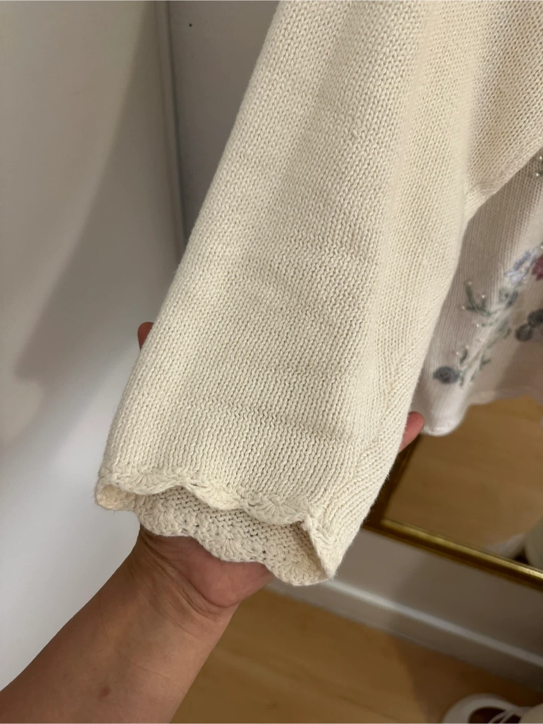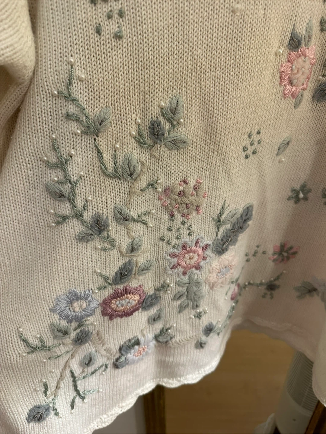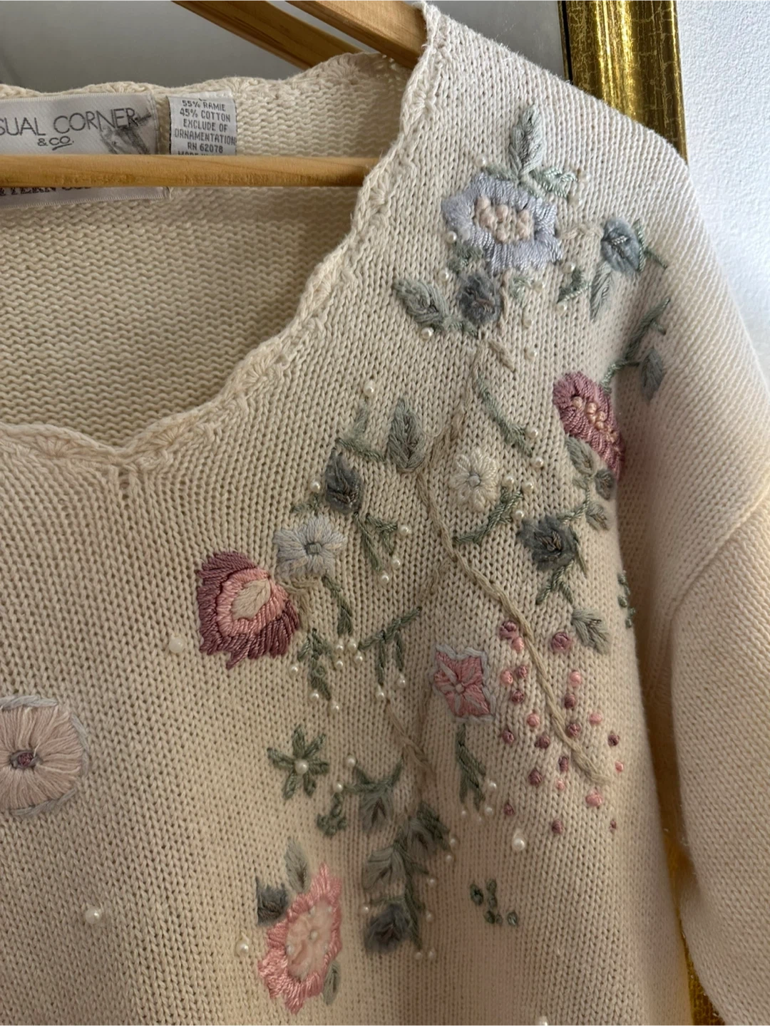 This cream-coloured sweater features delicate floral embroidery with small pearl accents. It's made from a blend of 55% ramie ( wool) and 45% cotton. The neckline and hem have a pretty scalloped edge.