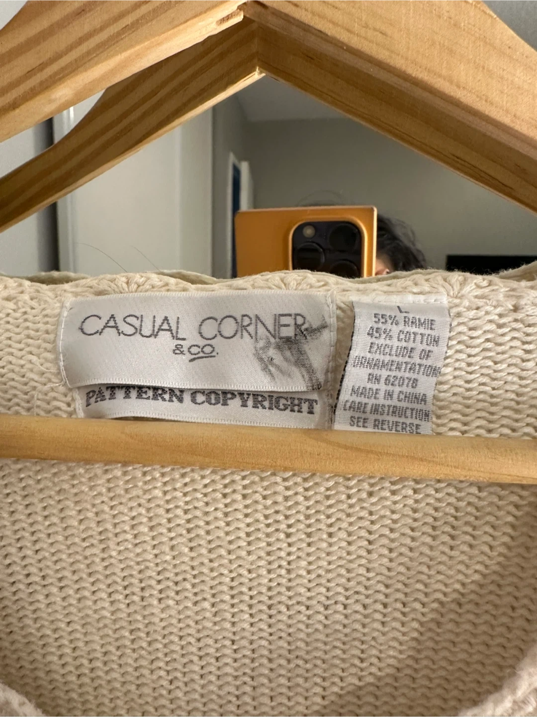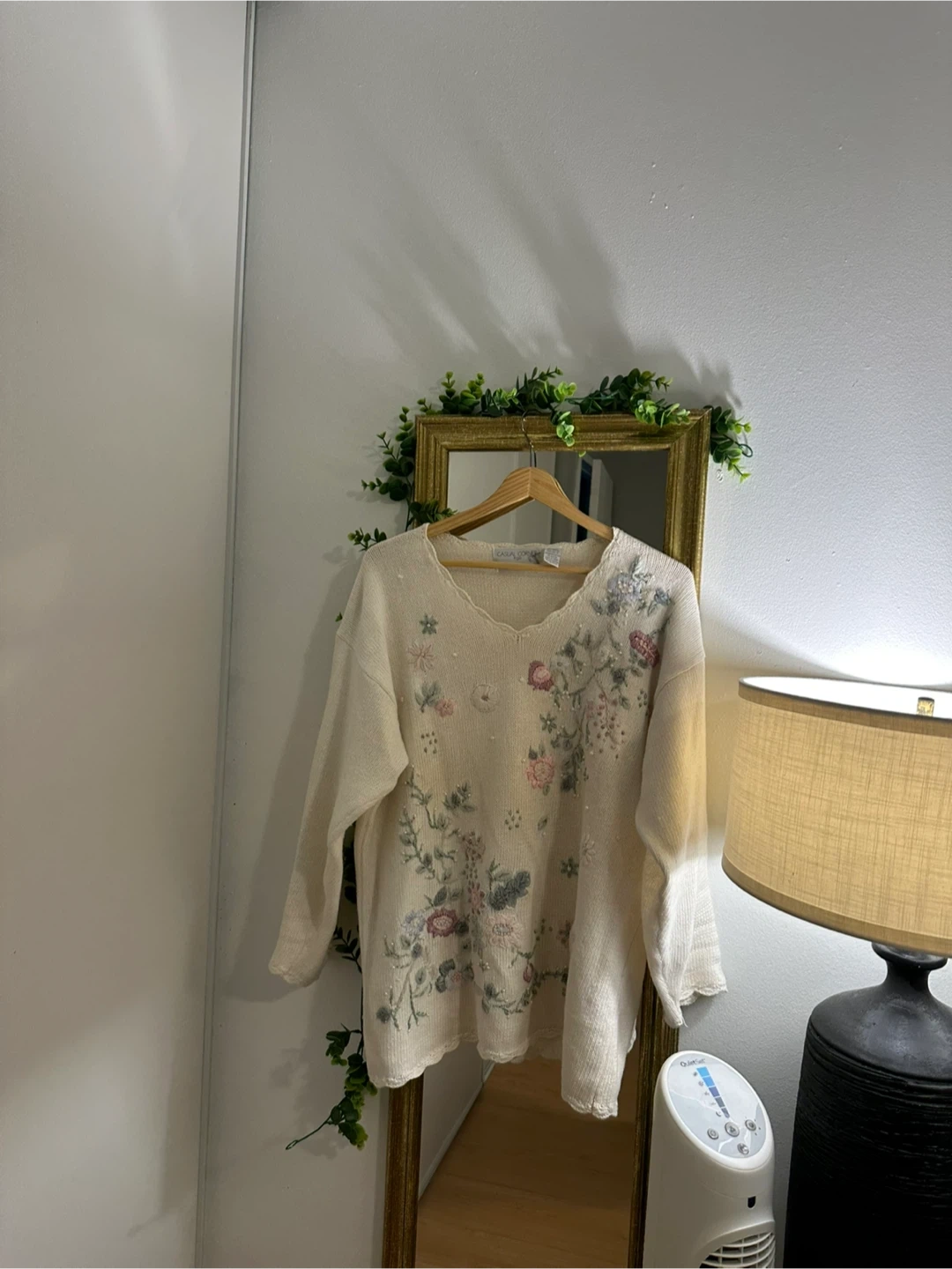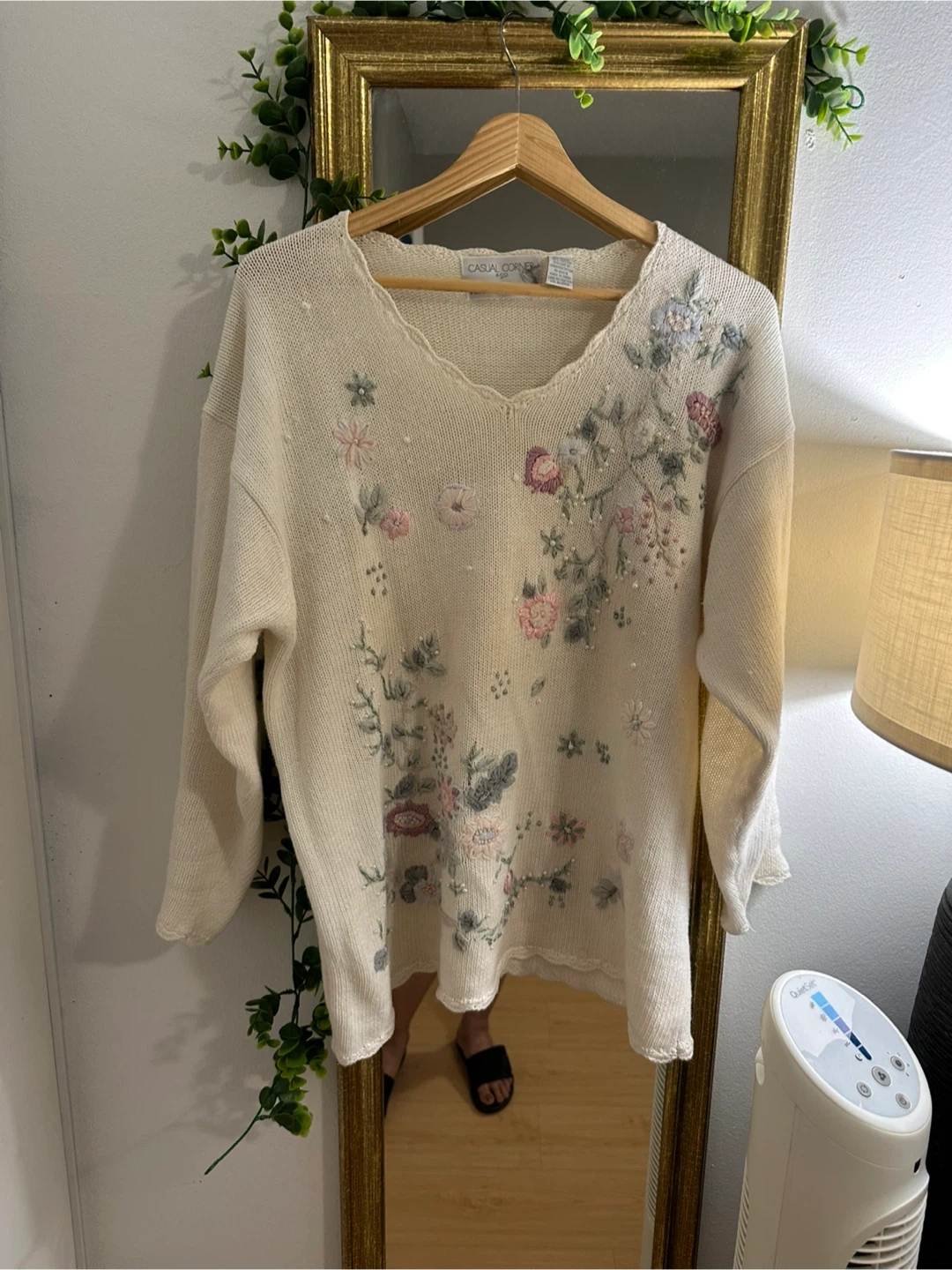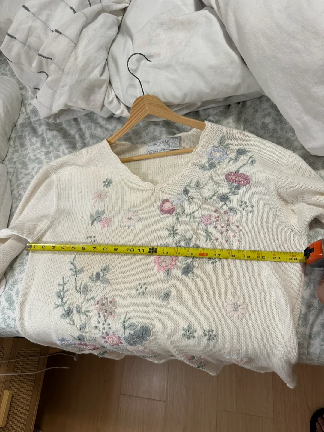 This cream-coloured sweater features delicate floral embroidery with small pearl accents. It's made from a blend of 55% ramie ( wool) and 45% cotton. The neckline and hem have a pretty scalloped edge.
