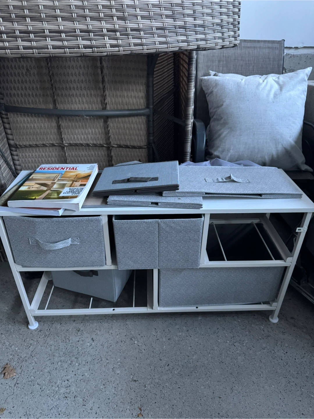 This shelf unit comes with multiple fabric storage bins. It's a great way to organize your space. The bins have handles for easy access. Assembly is straightforward.