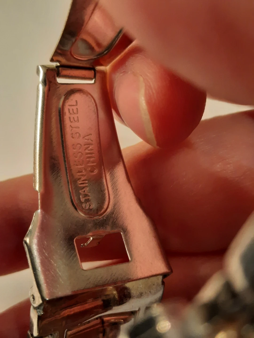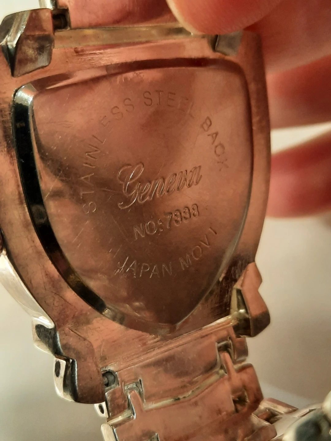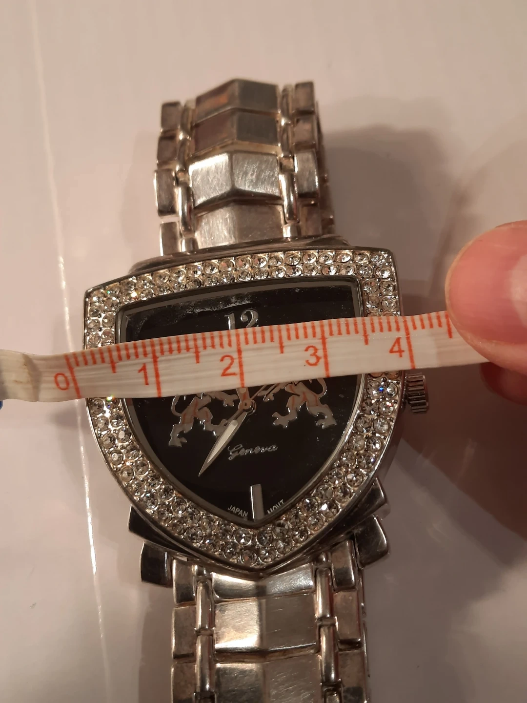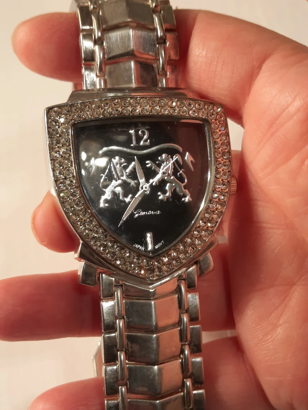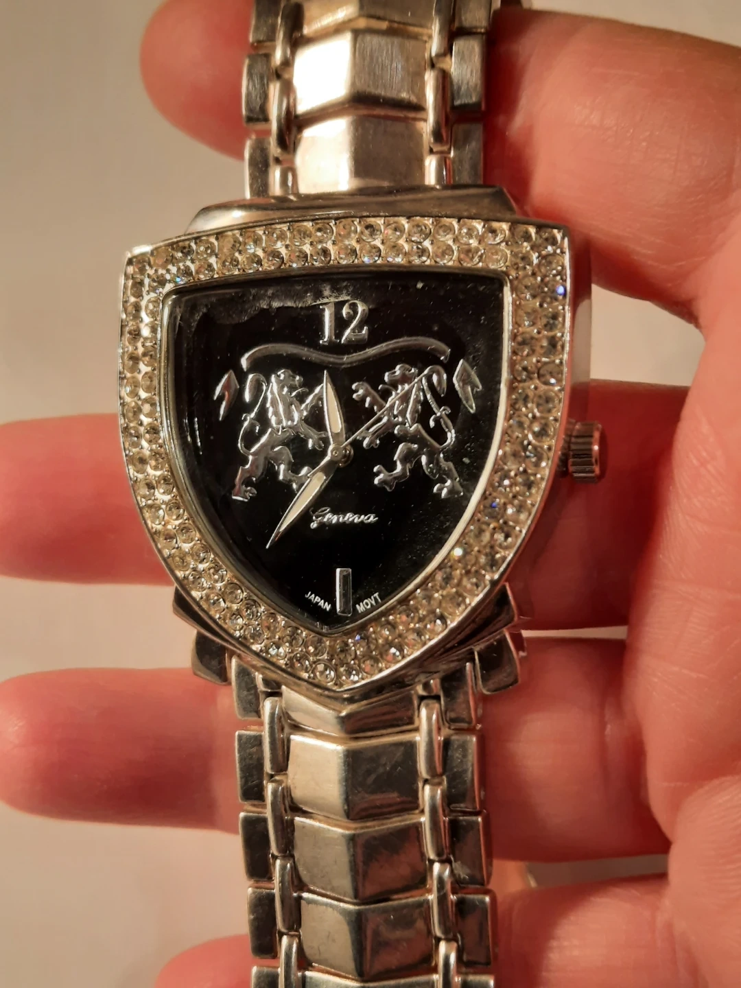 This is a Geneva shield-shaped watch with a crystal-embellished bezel. It has a metal band and a black dial featuring two lions and the Geneva name. The case back is stainless steel and it's a Japan Movt.