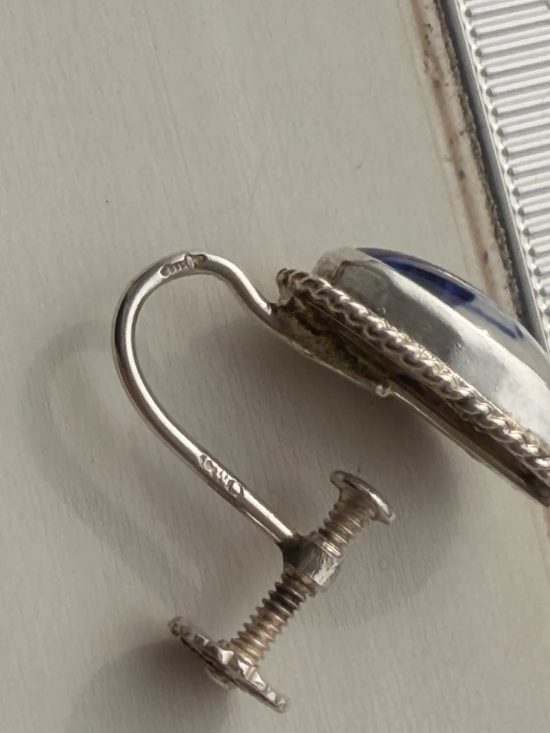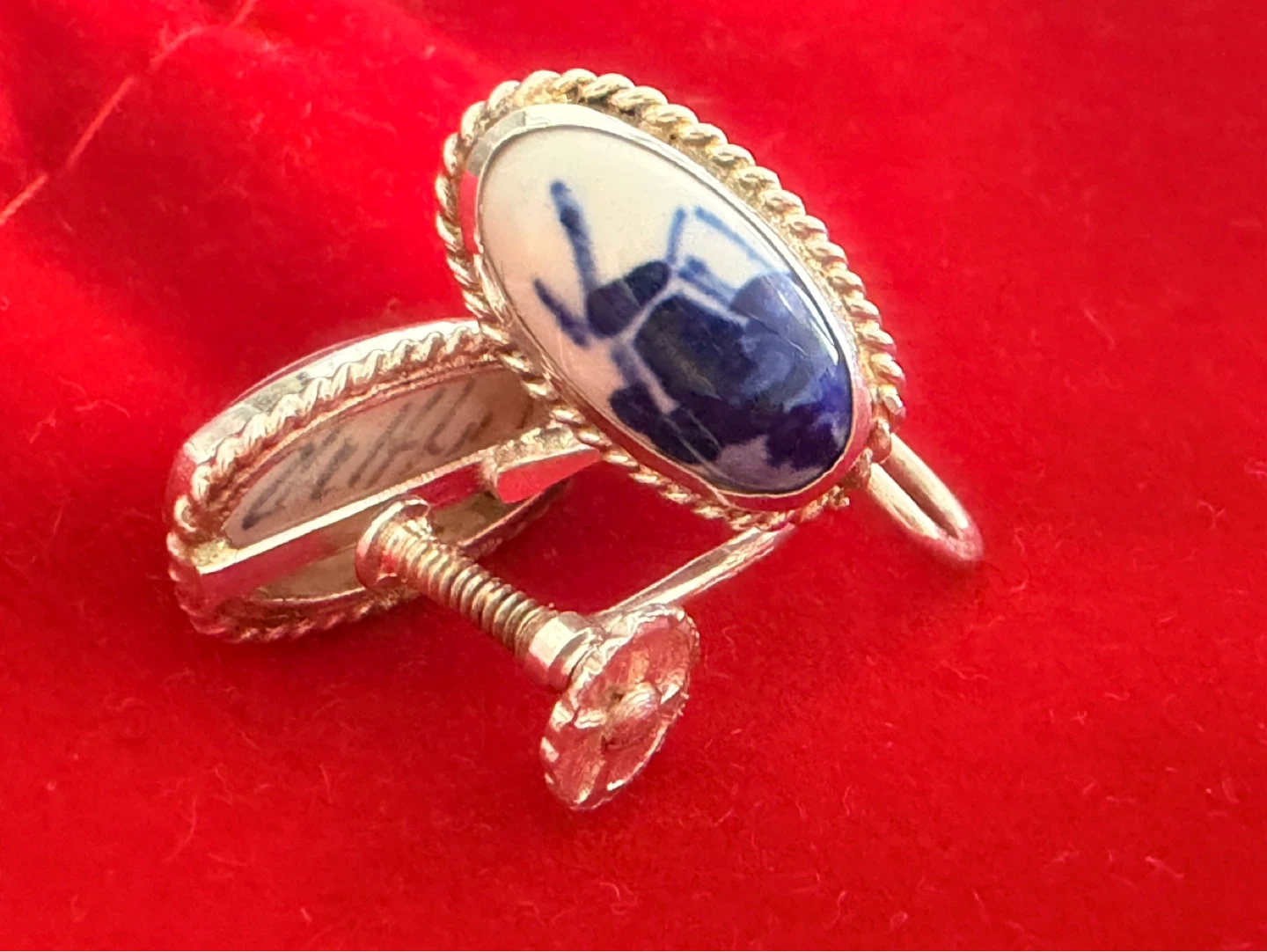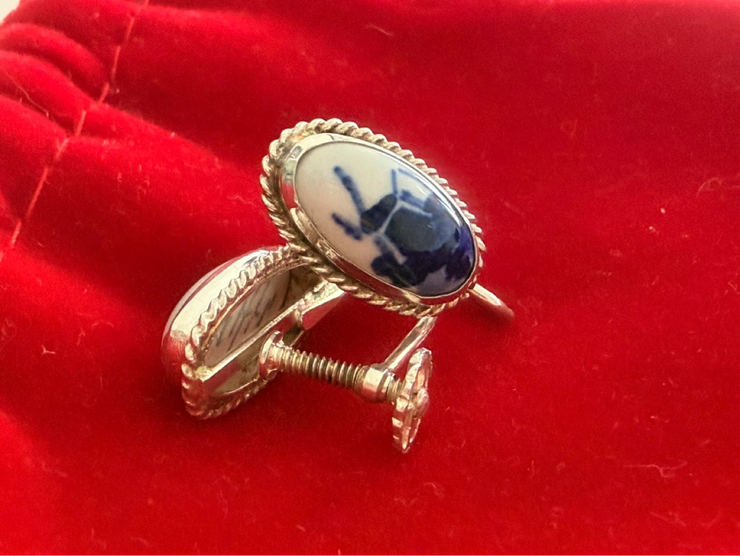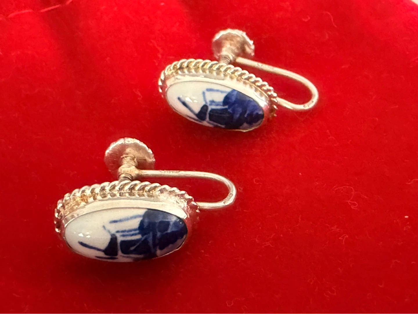 Vintage Delft Blue & 925 Sterling Silver Windmill Earrings