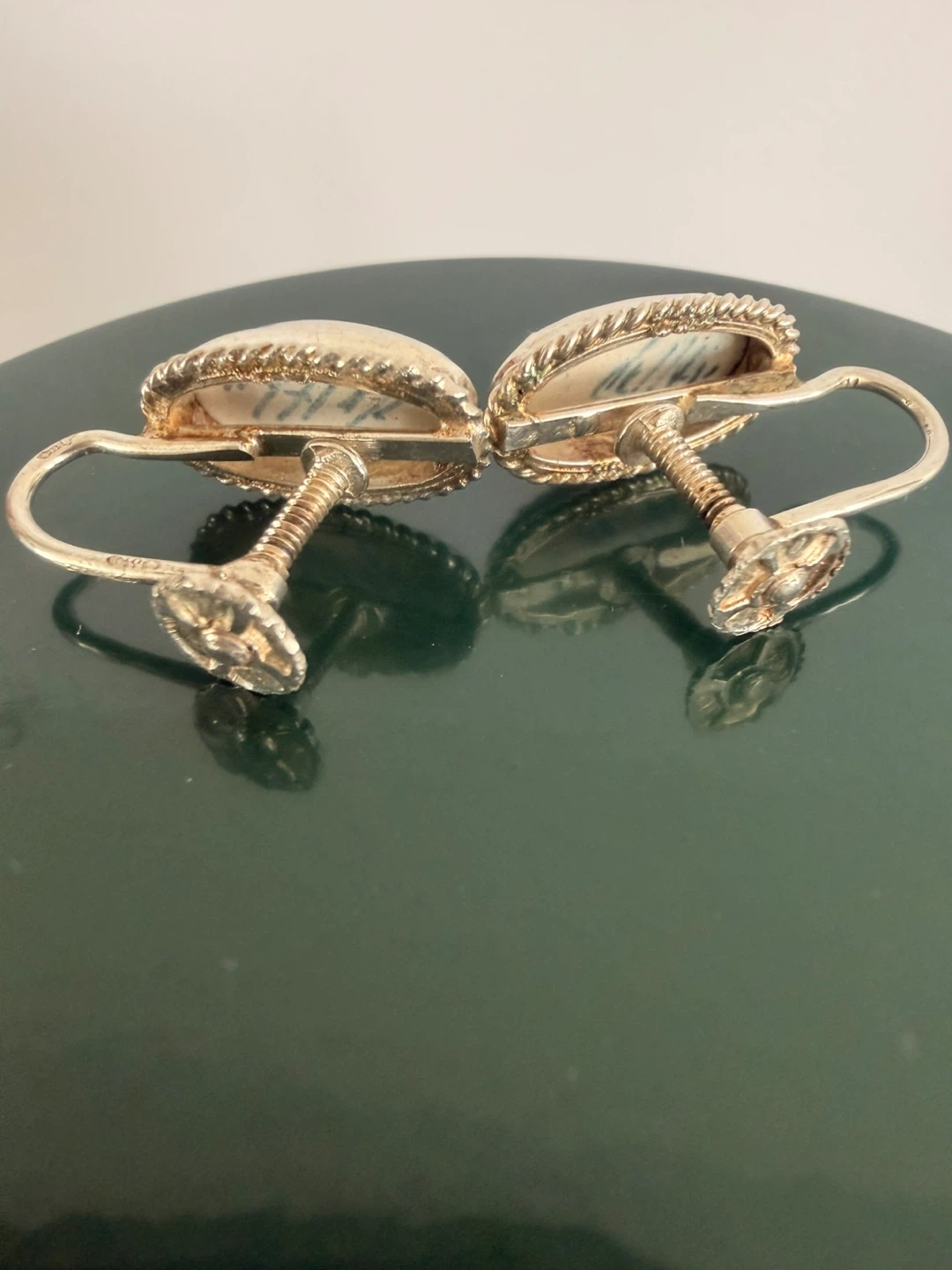 Beautiful pair of authentic hand-painted Delft Blue porcelain earrings. These vintage pieces feature the iconic Dutch windmill motif in cobalt blue on a crisp white ceramic cabochon.