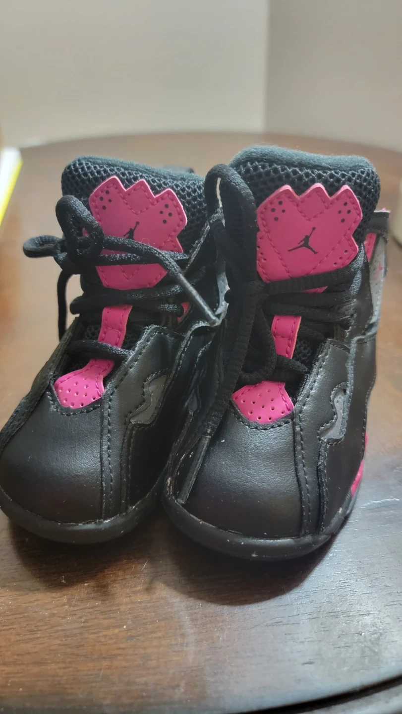 Toddler Jordan crib shoes in black and pink. Lace-up closure for a secure fit. Includes the iconic Jumpman logo. Perfect for little ones starting their sneaker journey!