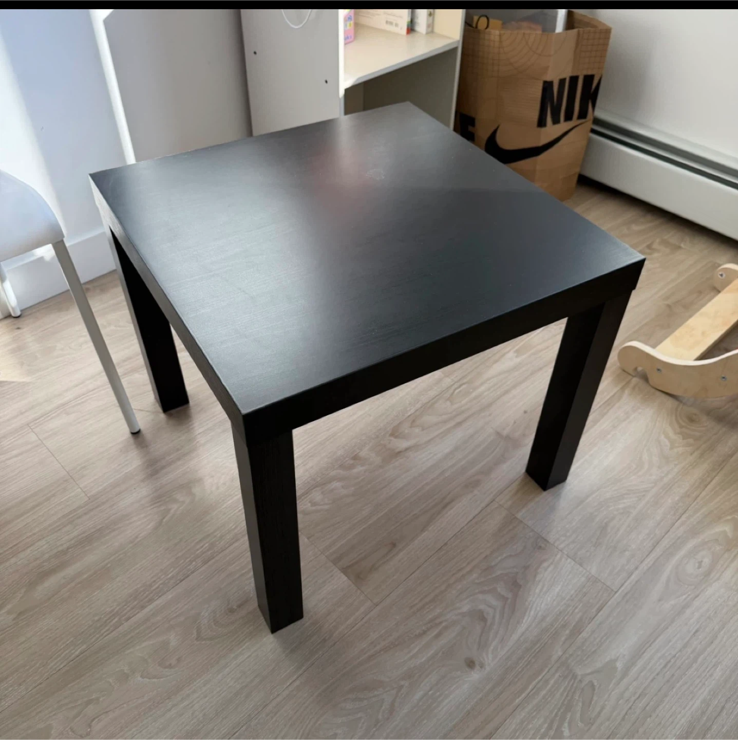 Simple black square coffee table. It's a handy size for a living room or even a kid's play area. Constructed from durable particleboard with an acrylic finish.