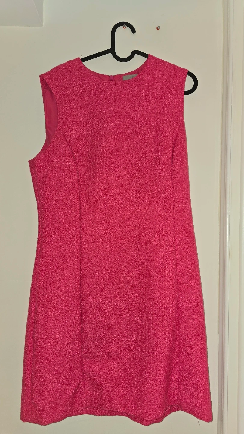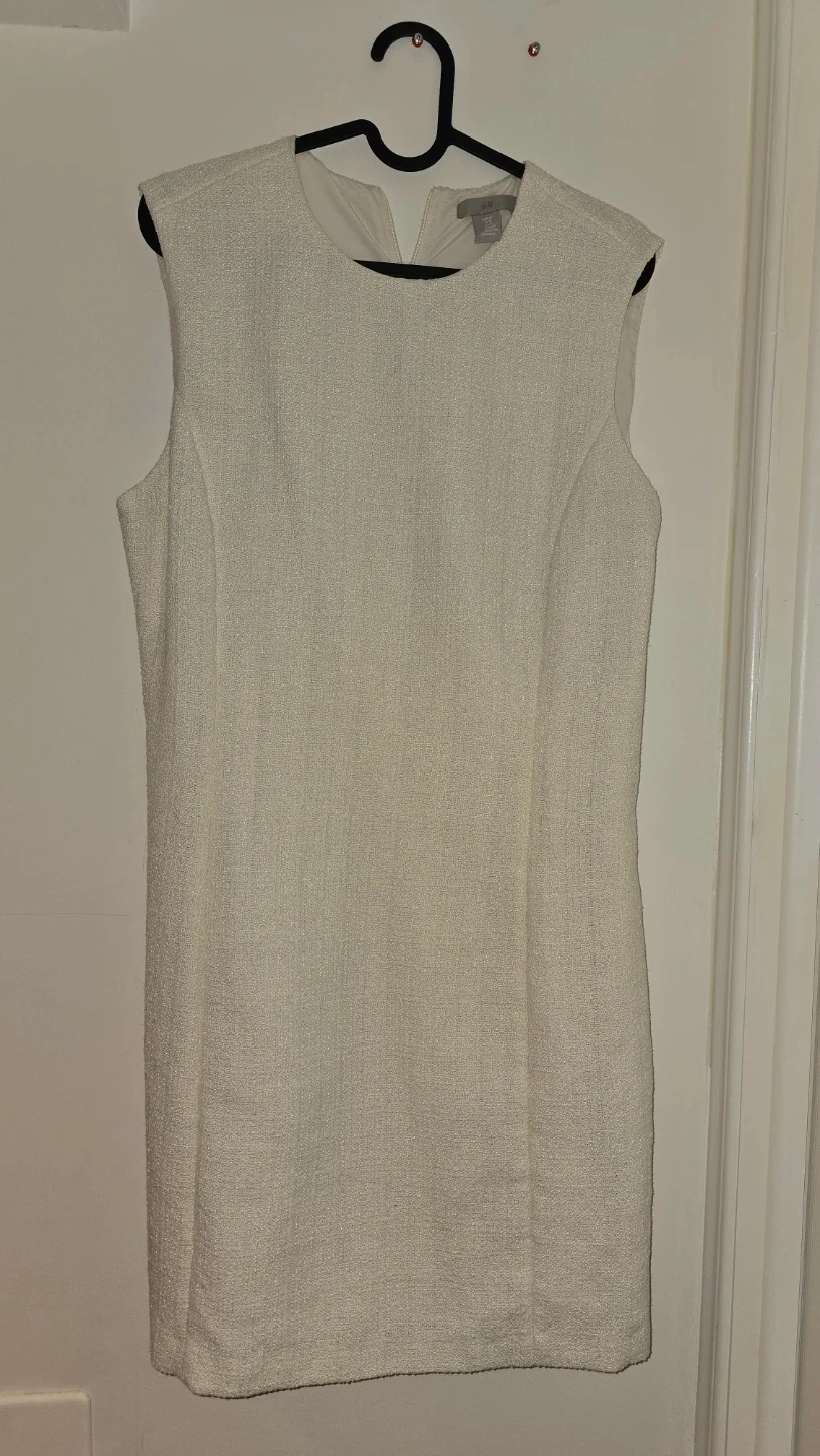Two sleeveless sheath dresses from H&M. One in a vibrant pink and the other in a cream colour. Both feature a textured fabric and a classic sheath silhouette. Perfect for dressing up or down!