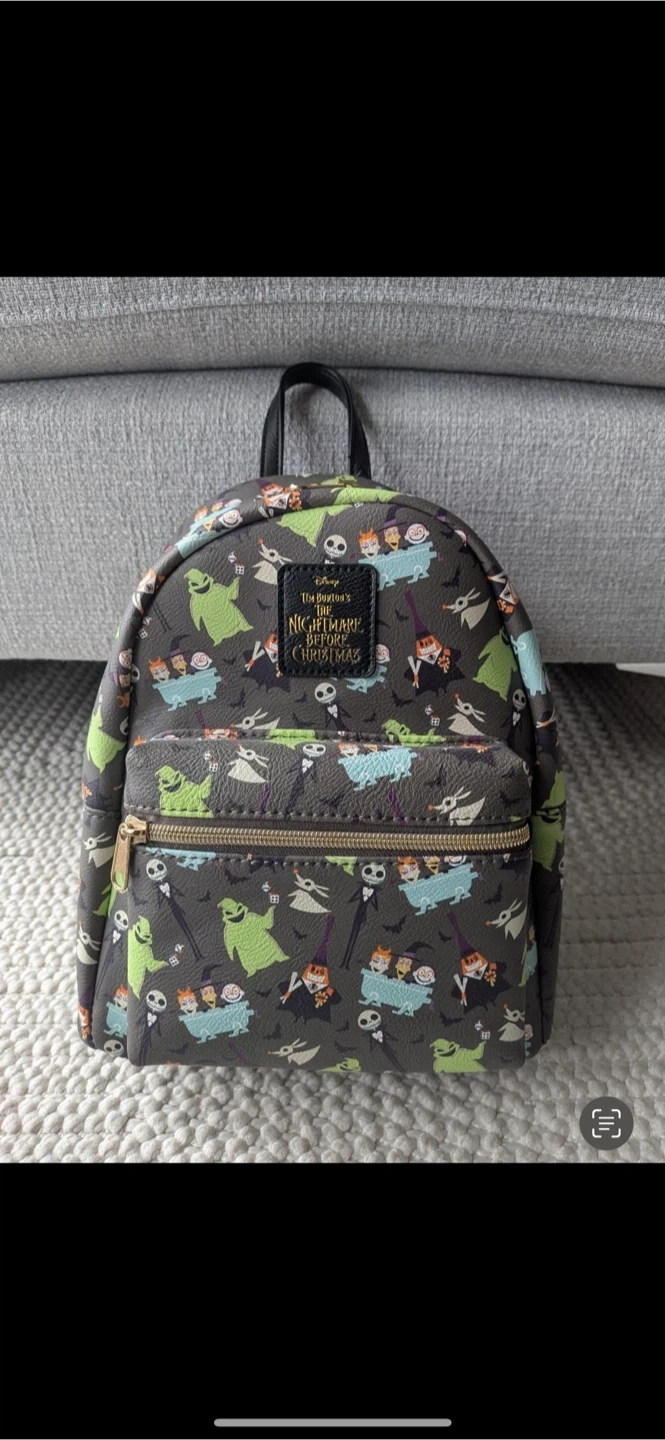This Loungefly mini backpack features characters from The Nightmare Before Christmas. It has adjustable straps and a zippered front pocket. It's made of faux leather.