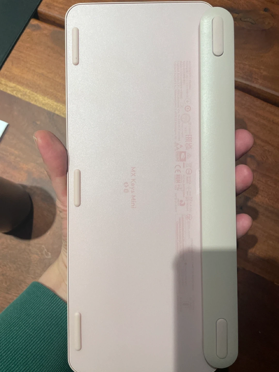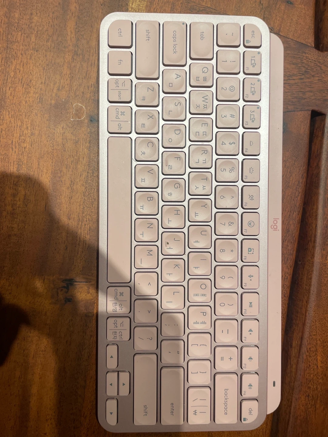 This is a Logitech MX Keys Mini wireless keyboard in a mind pink colour. It's a compact and comfortable keyboard. It's designed for productivity and has a modern aesthetic.