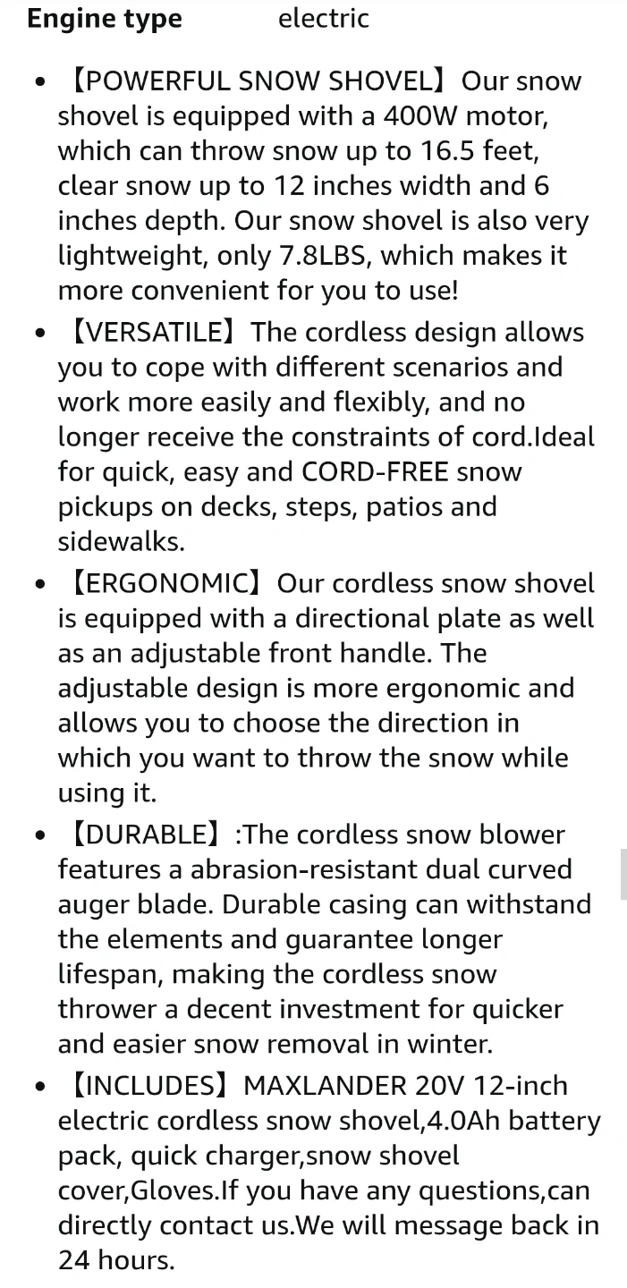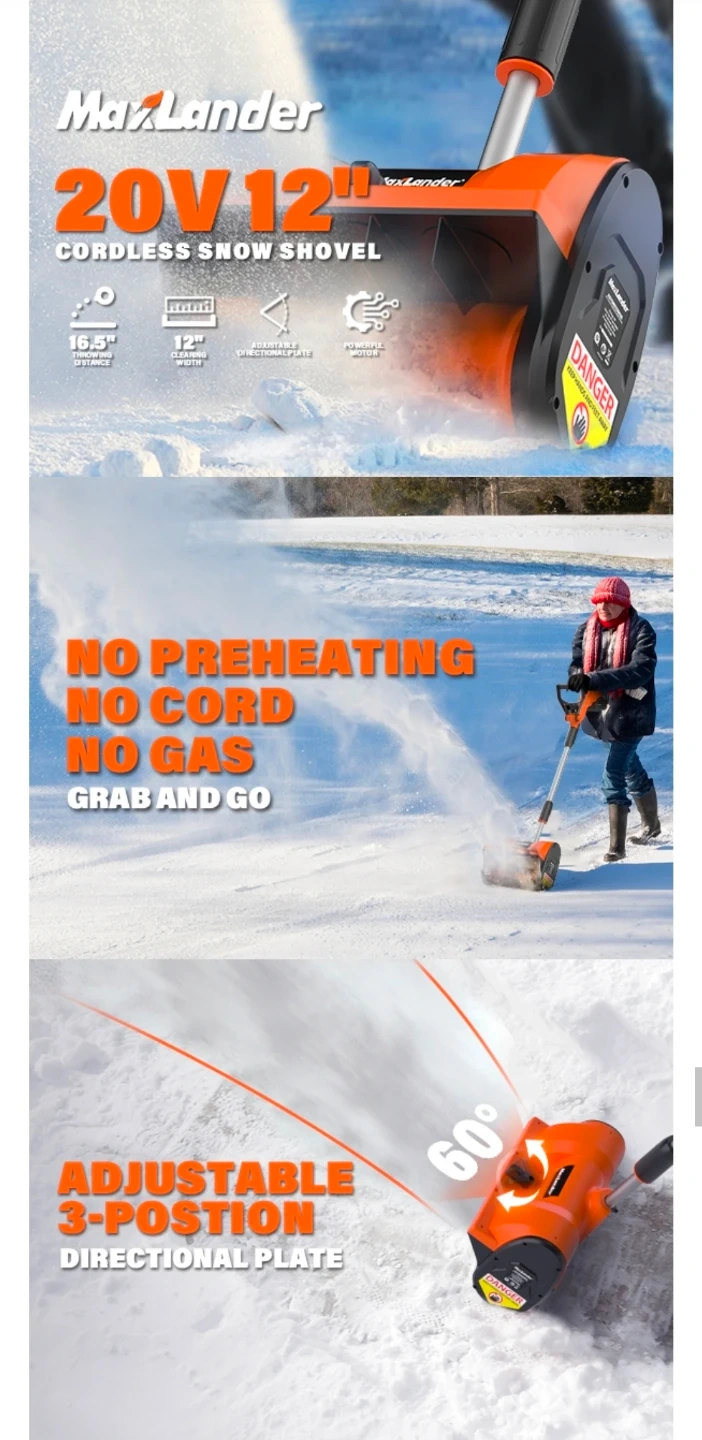 Clear your walkways with ease using this MaxLander 20V 12-inch cordless snow shovel! This snow shovel is equipped with a 400W motor, can throw snow up to 16.5 feet, and clear snow up to 12 inches wide and 6 inches deep. Lightweight at only 7.8lbs, it's a breeze to maneuver! This cordless snow shovel allows you to tackle different scenarios with ease and flexibility. Say goodbye to cords and hello to quick, easy, and CORD-FREE pickups on decks, steps, patios, and sidewalks.