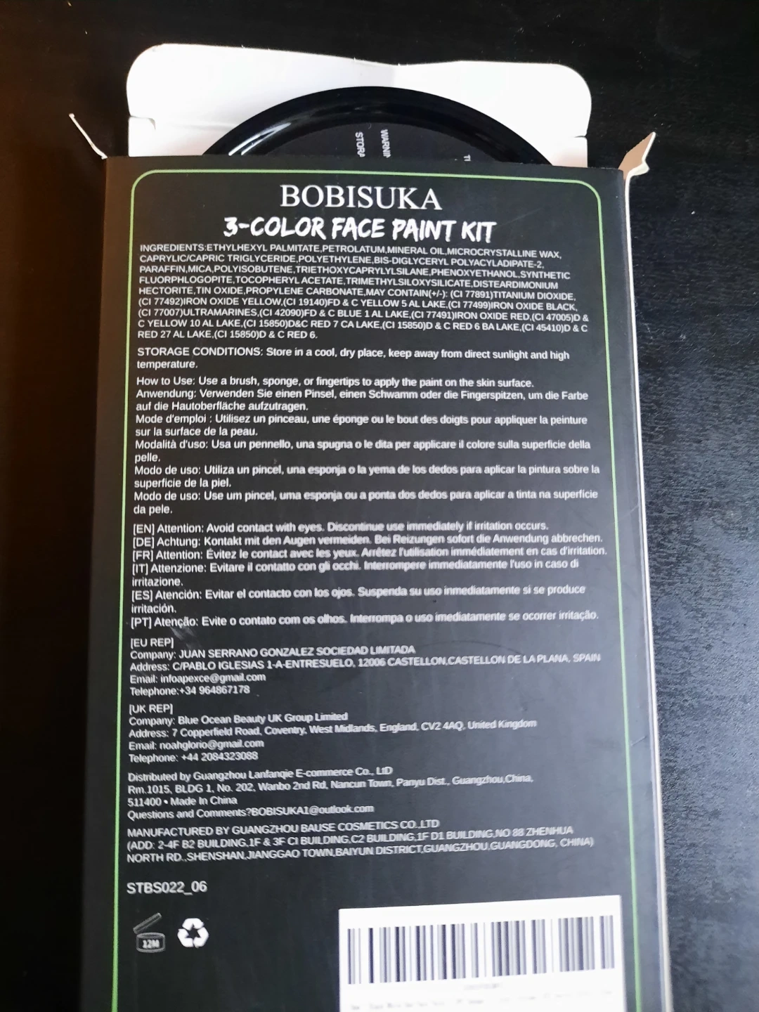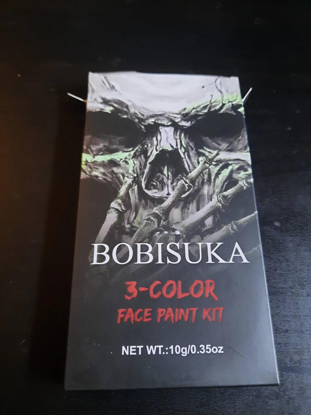 This Bobisuka 3-Color Face Paint Kit contains black, white, and red shades. Net weight is 10g/0.35oz. For external use only. Open box, unused. Selling because i missed the return date.