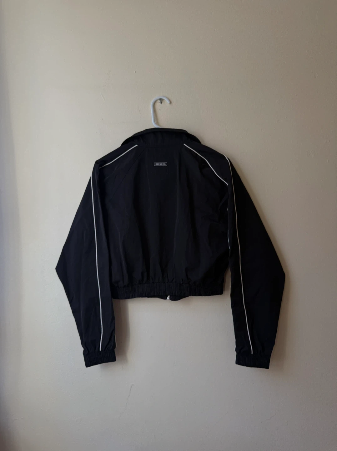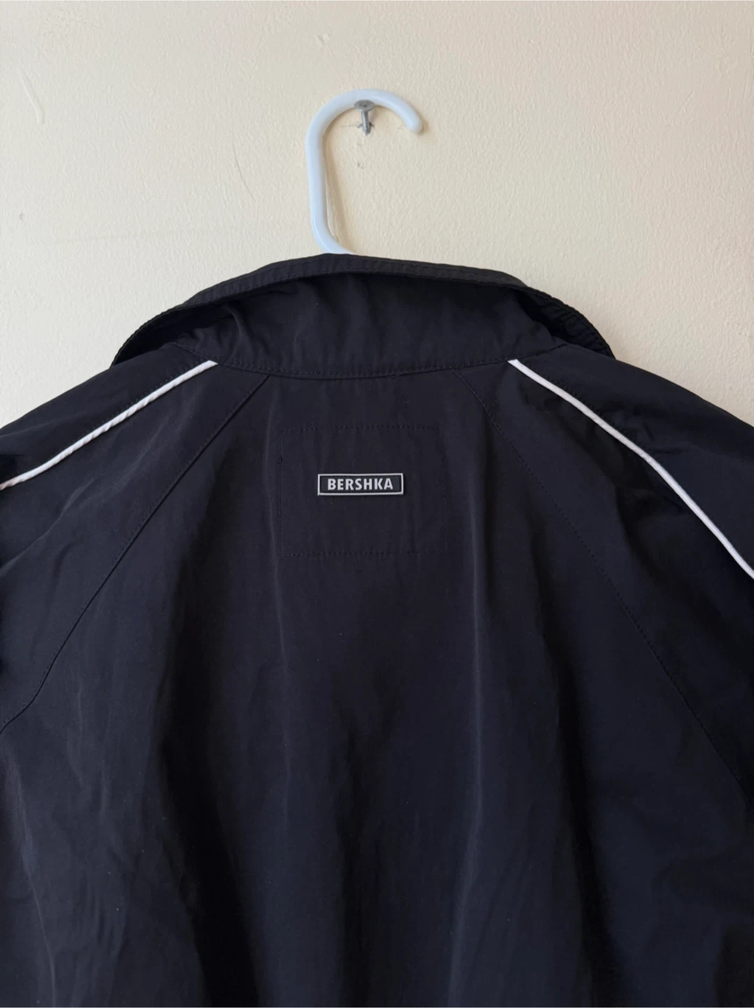 A stylish black cropped track jacket from Bershka. Features white piping details and a full zip closure. It's a size XS (EUR S, US S, MEX 26).