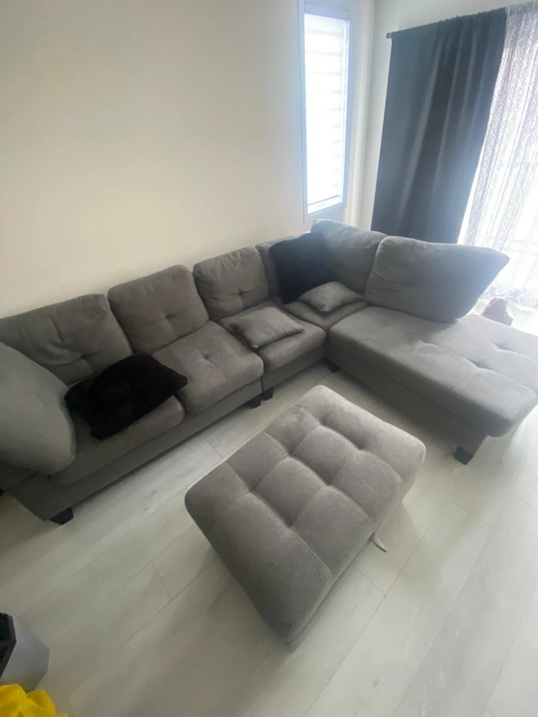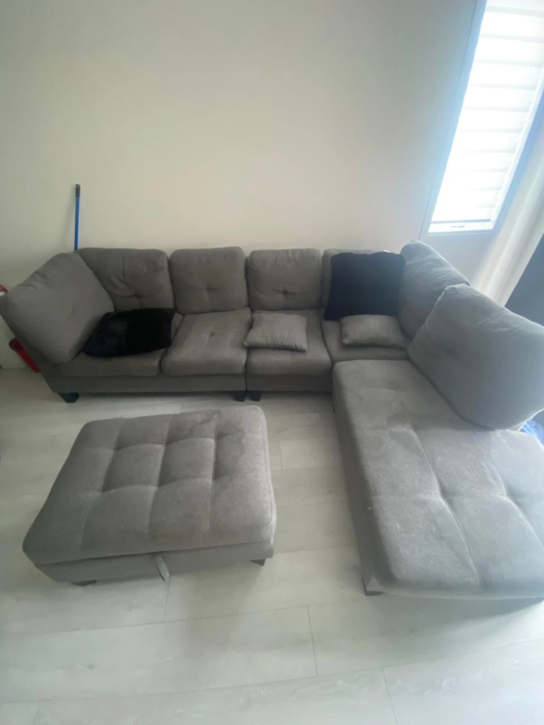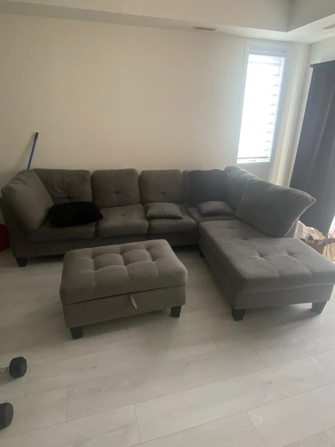 This is a gray sectional sofa. It's upholstered in a textured fabric and features tufted seat cushions.