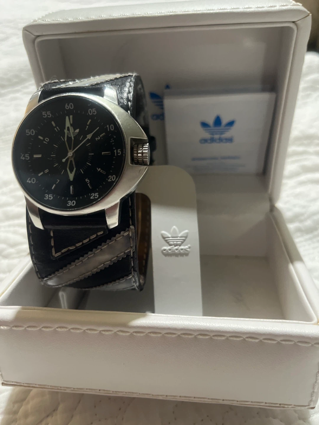 Selling an Adidas watch with a black leather band. It comes with its original box and paperwork. The watch face is black with silver accents. A stylish and sporty timepiece!
