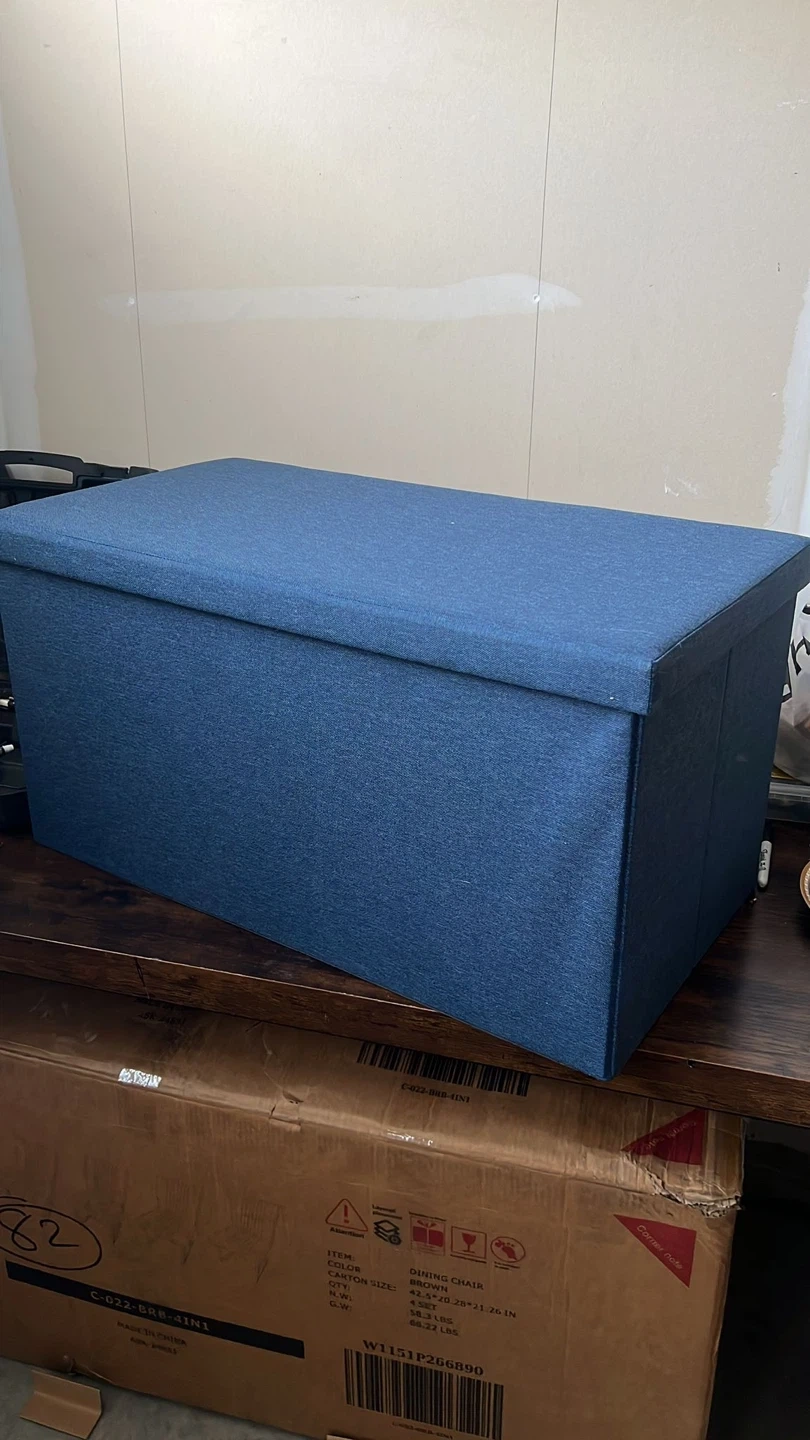 This storage ottoman is upholstered in a durable blue fabric and can be used as extra seating or a footrest. It folds flat for convenient storage when not in use. Measures approximately 30" L x 15" W x 15" H.