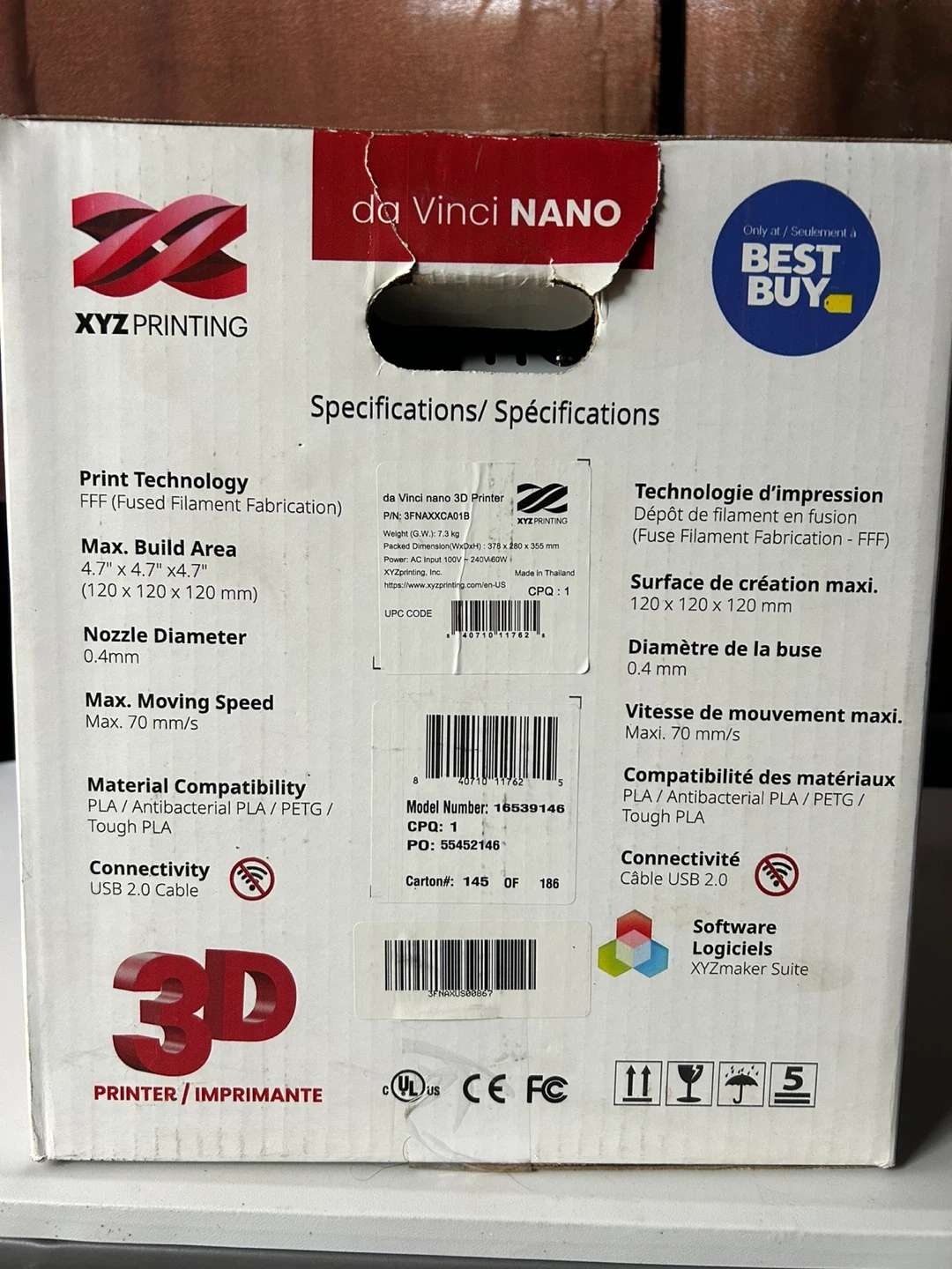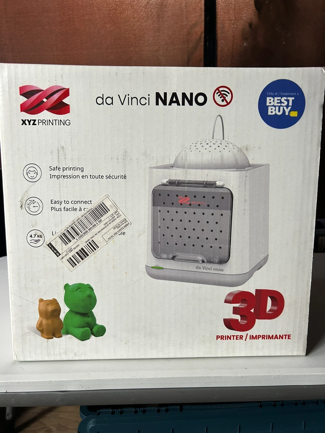 Selling a brand new XYZPrinting da Vinci Nano 3D Printer, still in its original box! Key features: - Safe printing - Easy to connect - Lightweight and transportable (4.7 kg) Tech specs: - Print Technology: FFF (Fused Filament Fabrication) - Max Build Area: 4.7" x 4.7" x 4.7" (120 x 120 x 120 mm) - Material Compatibility: PLA / Antibacterial PLA / PETG / Tough PLA - Connectivity: USB 2.0 Cable