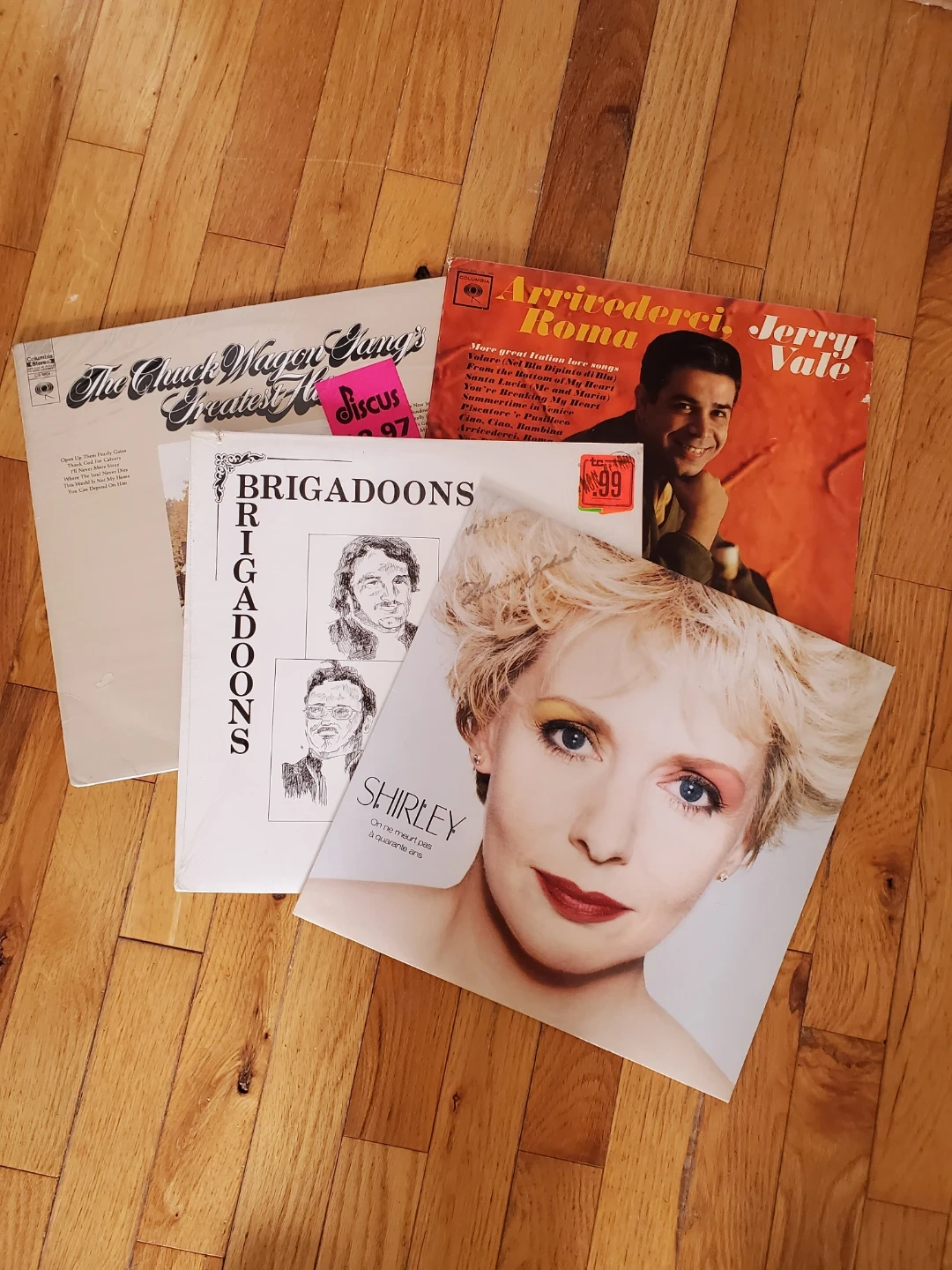 This listing includes four vinyl records: Jerry Vale's 'Arrivederci Roma', Shirley's 'On ne meurt pas à quarante ans', Brigadoons, and The Chuck Wagon Gang's 'Greatest Hits'.