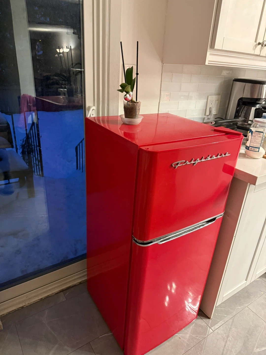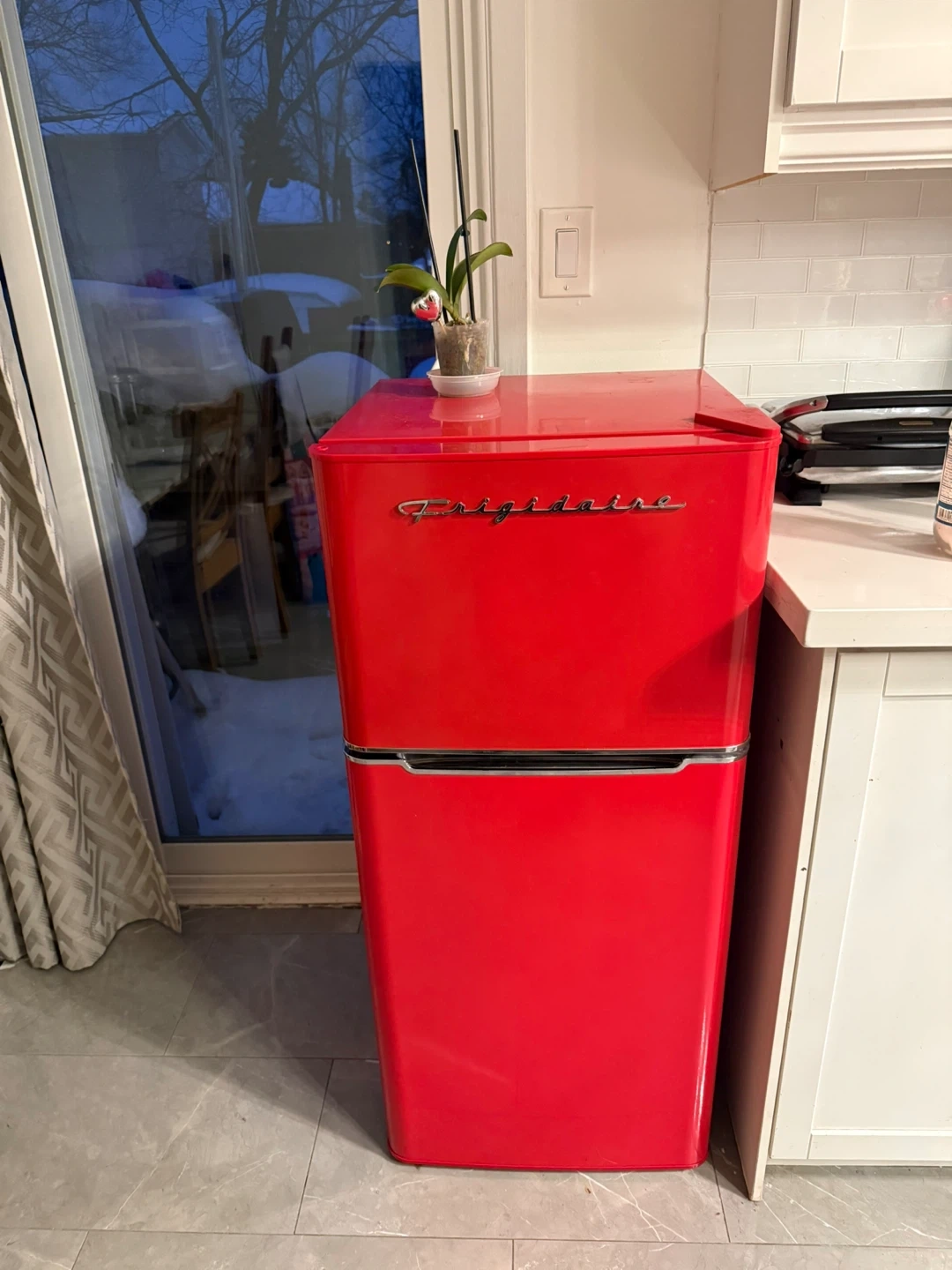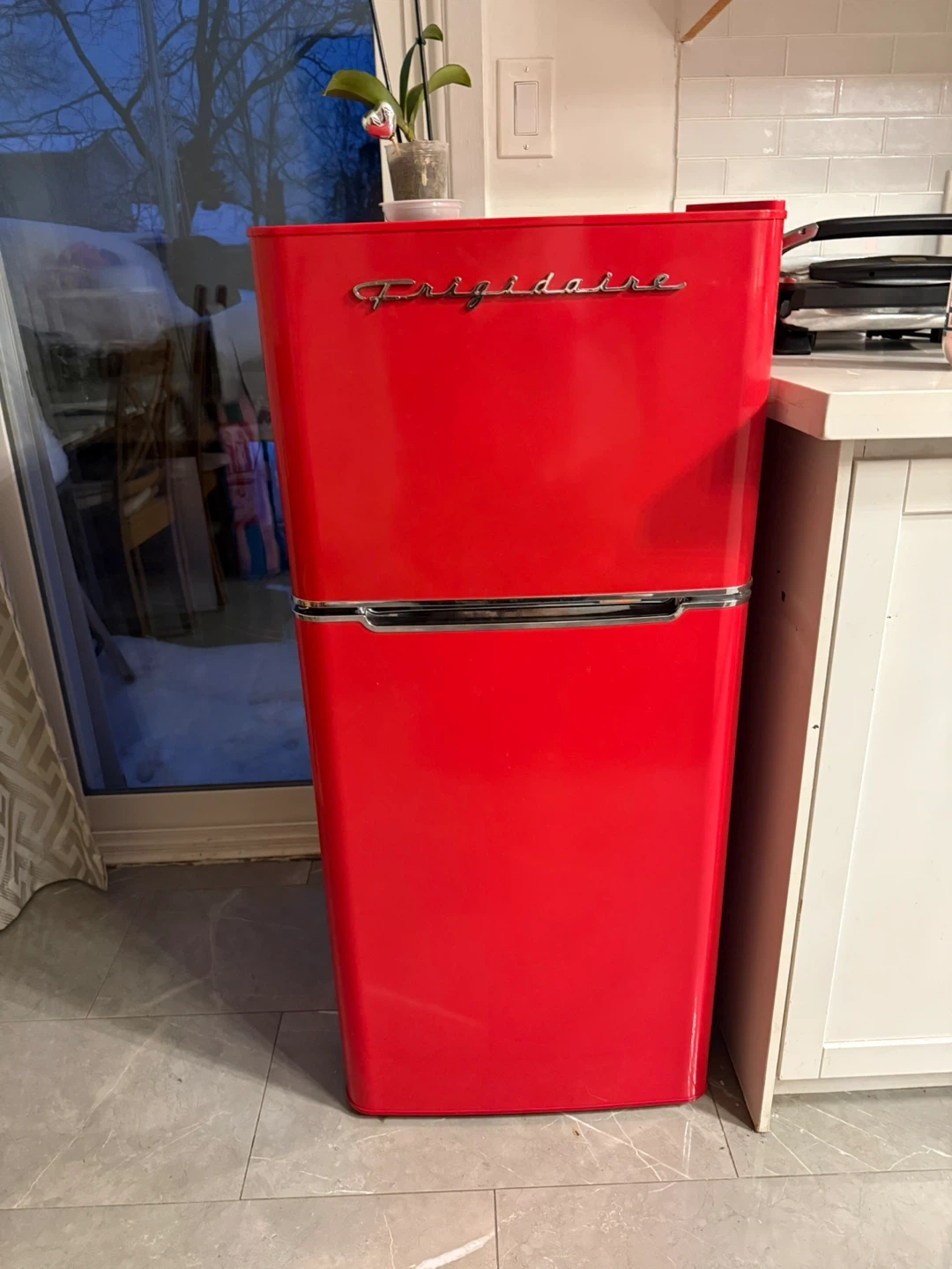 This Frigidaire mini fridge comes in a vibrant red colour with a retro design. It's perfect for a dorm room, office, or small apartment! Interior shelves are adjustable. Measures approximately 35.5 inches high and 19.7 inches wide.