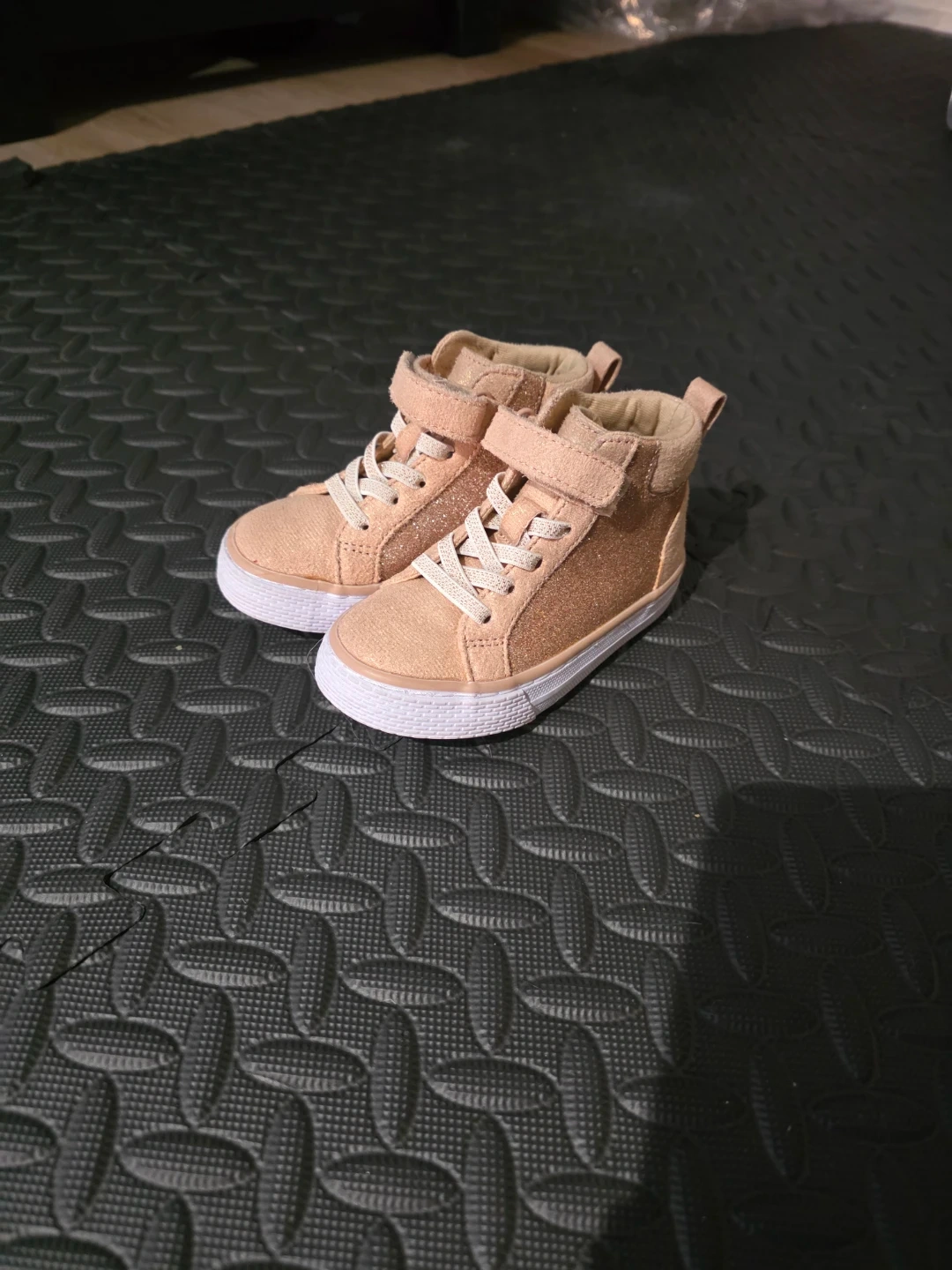 These cute high-top sneakers from The Children's Place have a fun glitter finish. They feature a lace-up closure with hook-and-loop straps for easy on and off. Size is 6.
