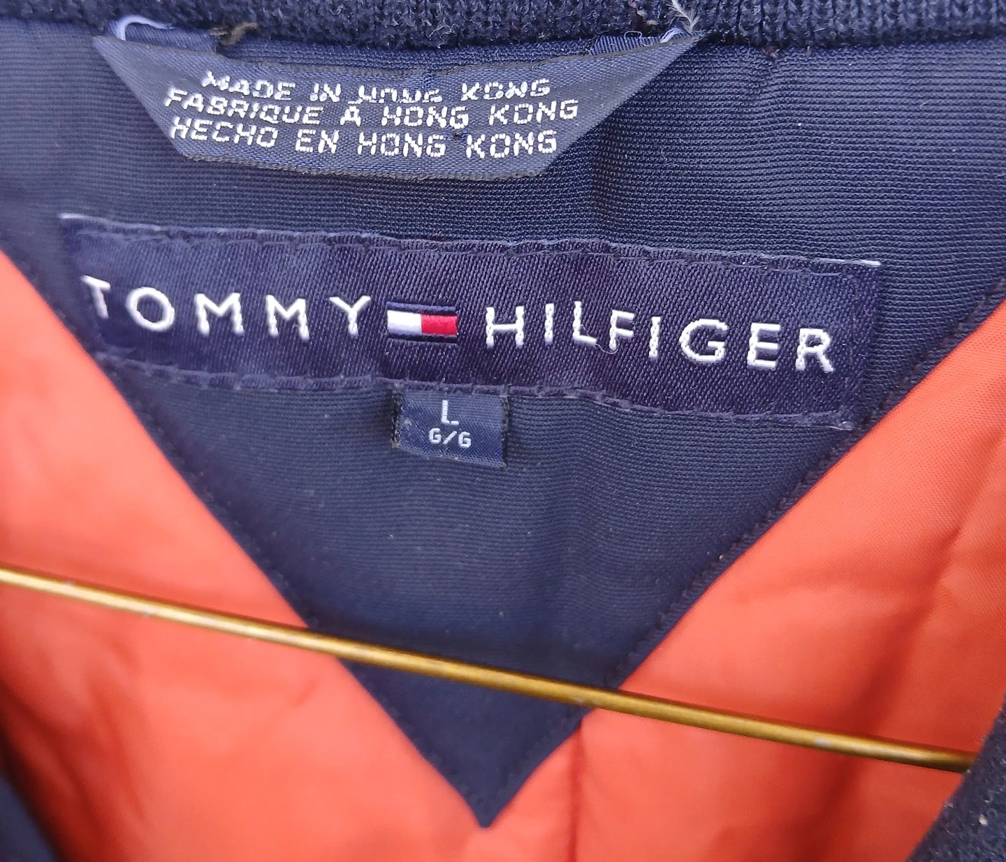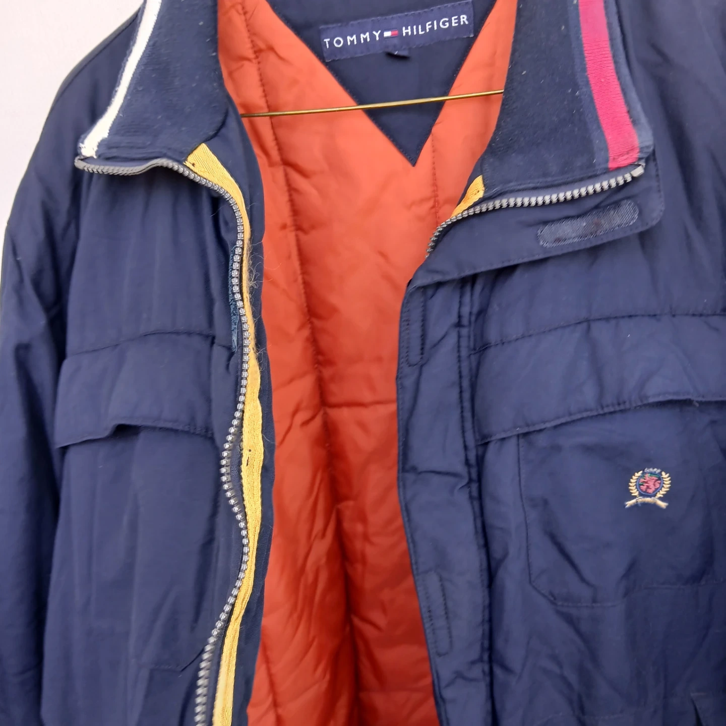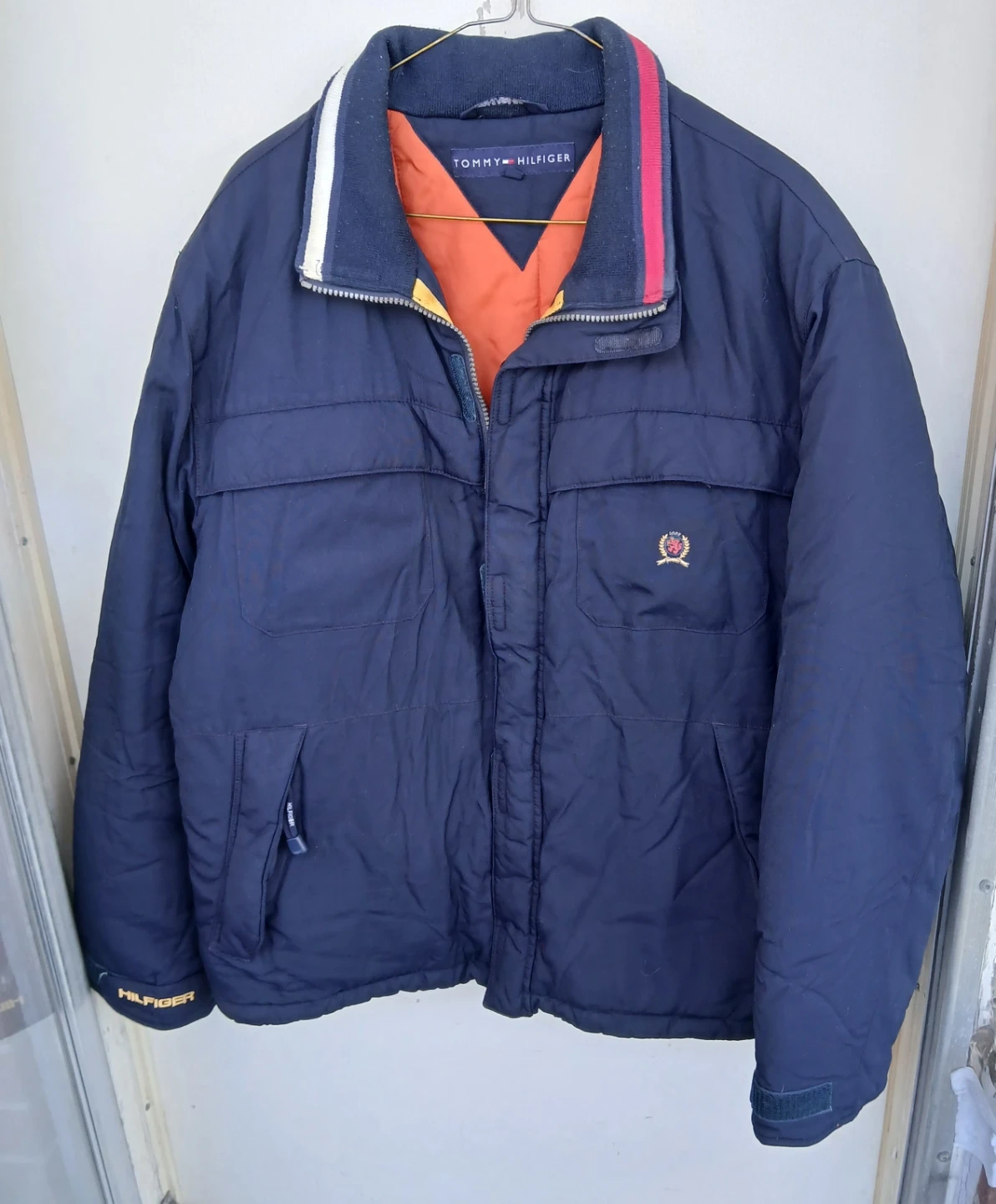 Tommy Hilfiger puffer jacket in navy. It's a size Large with a bright orange lining. Features a full zip closure and two front pockets.
