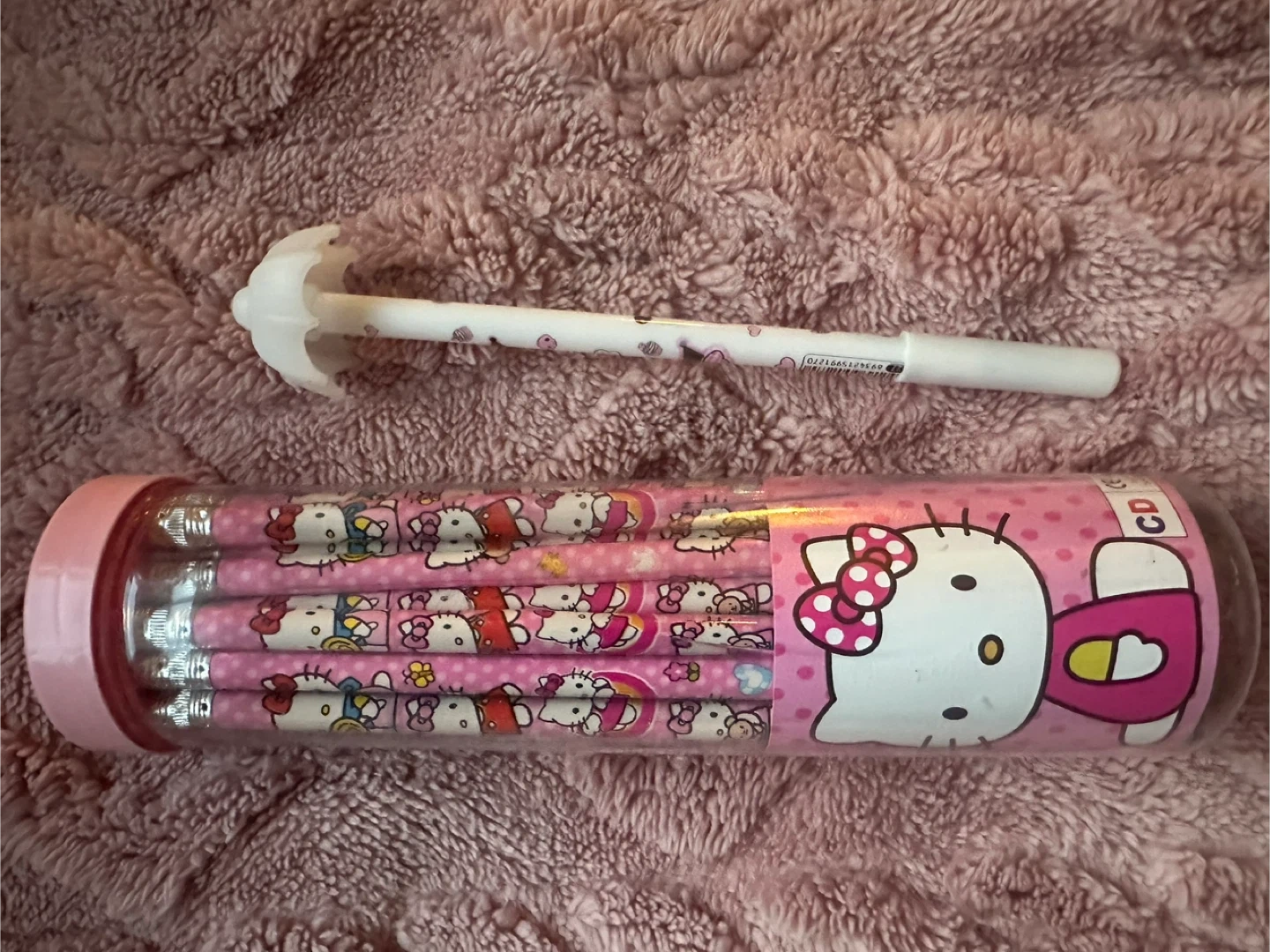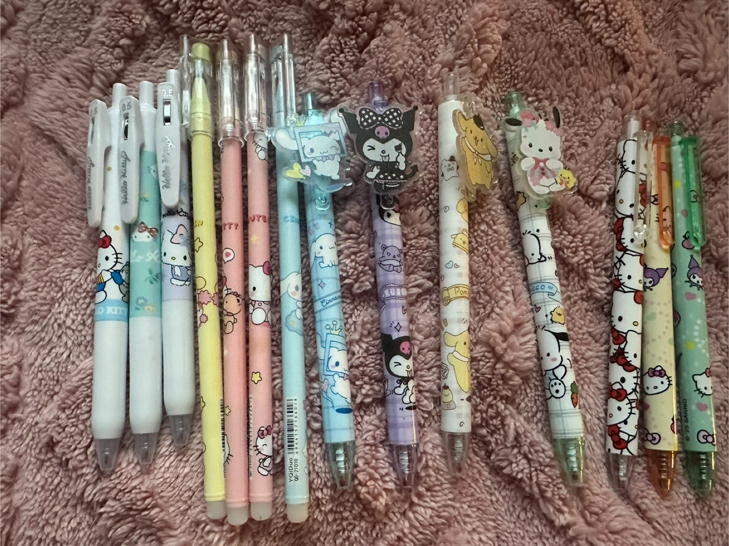 This set includes a container of Hello Kitty pencils and a collection of assorted Sanrio character pens. Great for school or any fan!