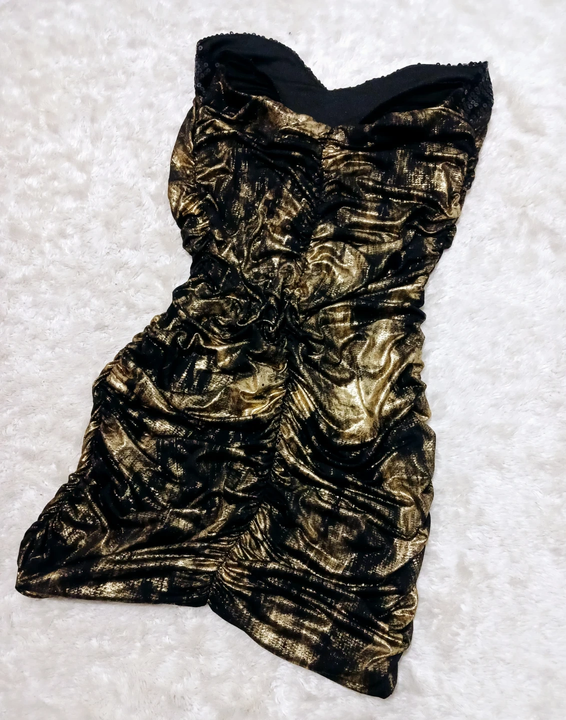 Selling a cute gold and black party dress! It's perfect for a night out or a special occasion. The dress features a strapless design with ruching throughout, adding a touch of elegance and style. The combination of gold and black creates a stunning and eye-catching look !