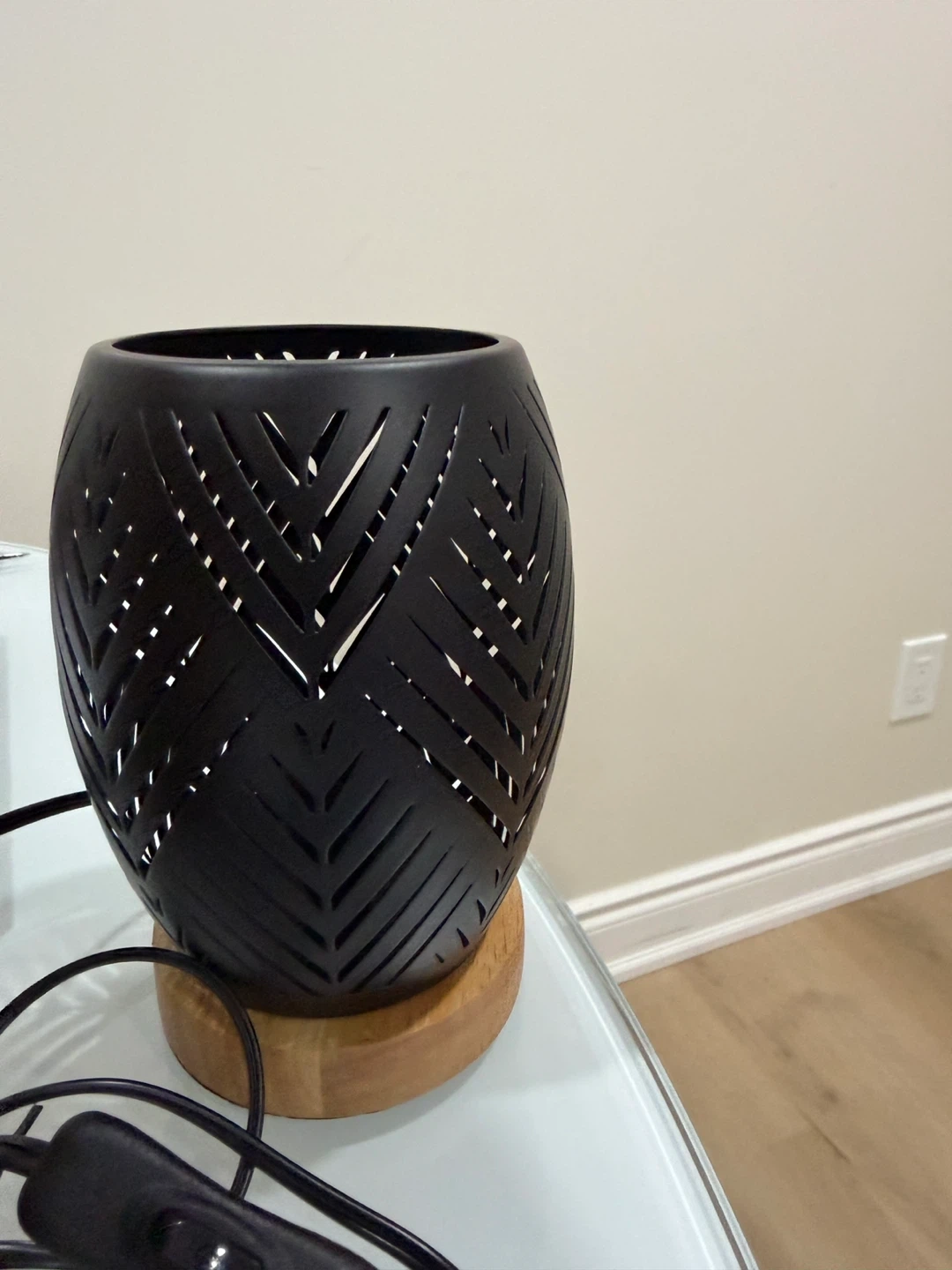 This decorative lantern lamp features a black metal design with cut-out patterns. It sits on a natural wood base and casts intricate shadows when lit. It's perfect for creating ambient lighting in any room.