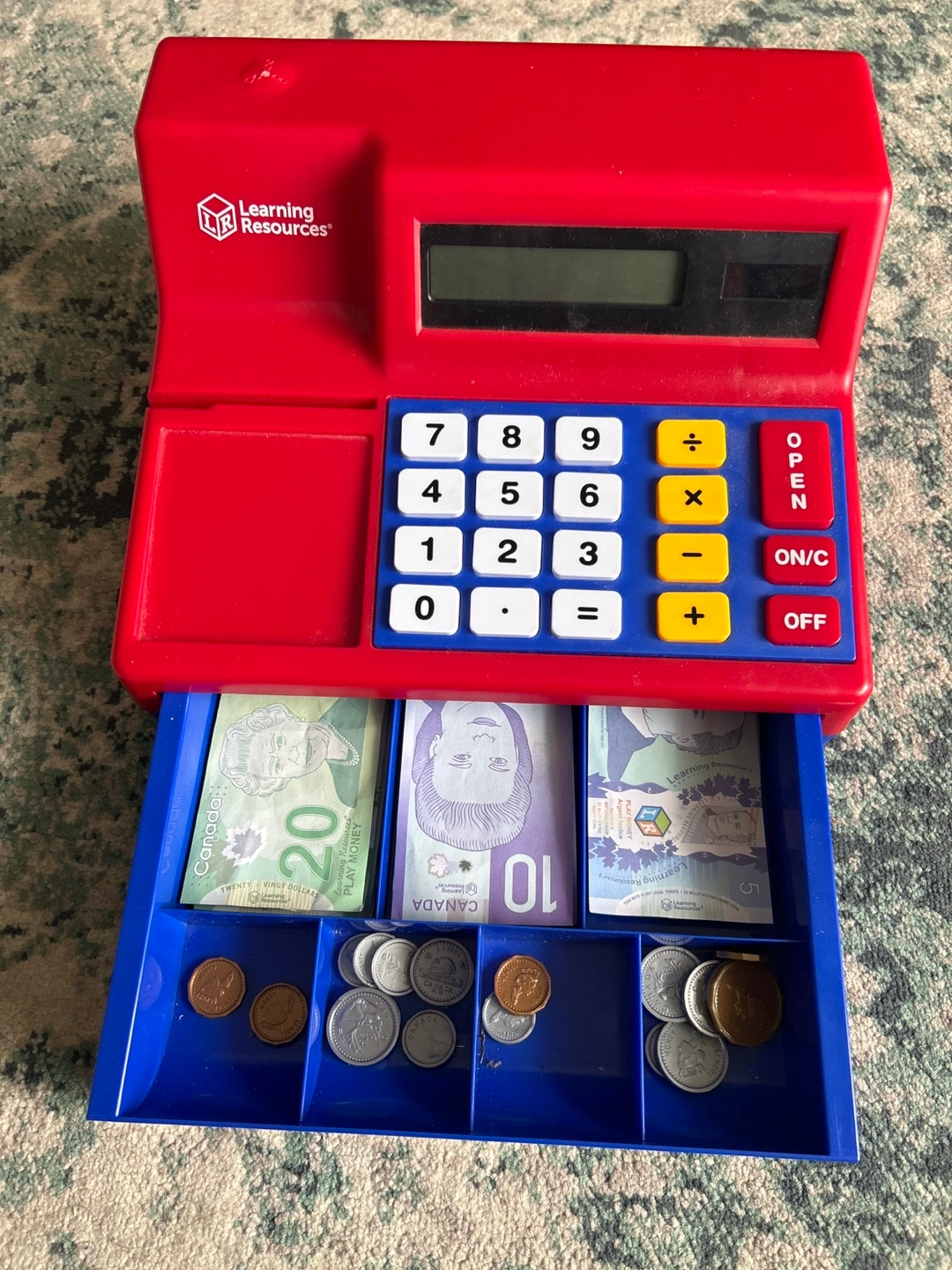 Red and blue plastic toy cash register. Features calculator, a small drawer, and a display screen. Includes pretend Canadian money.
