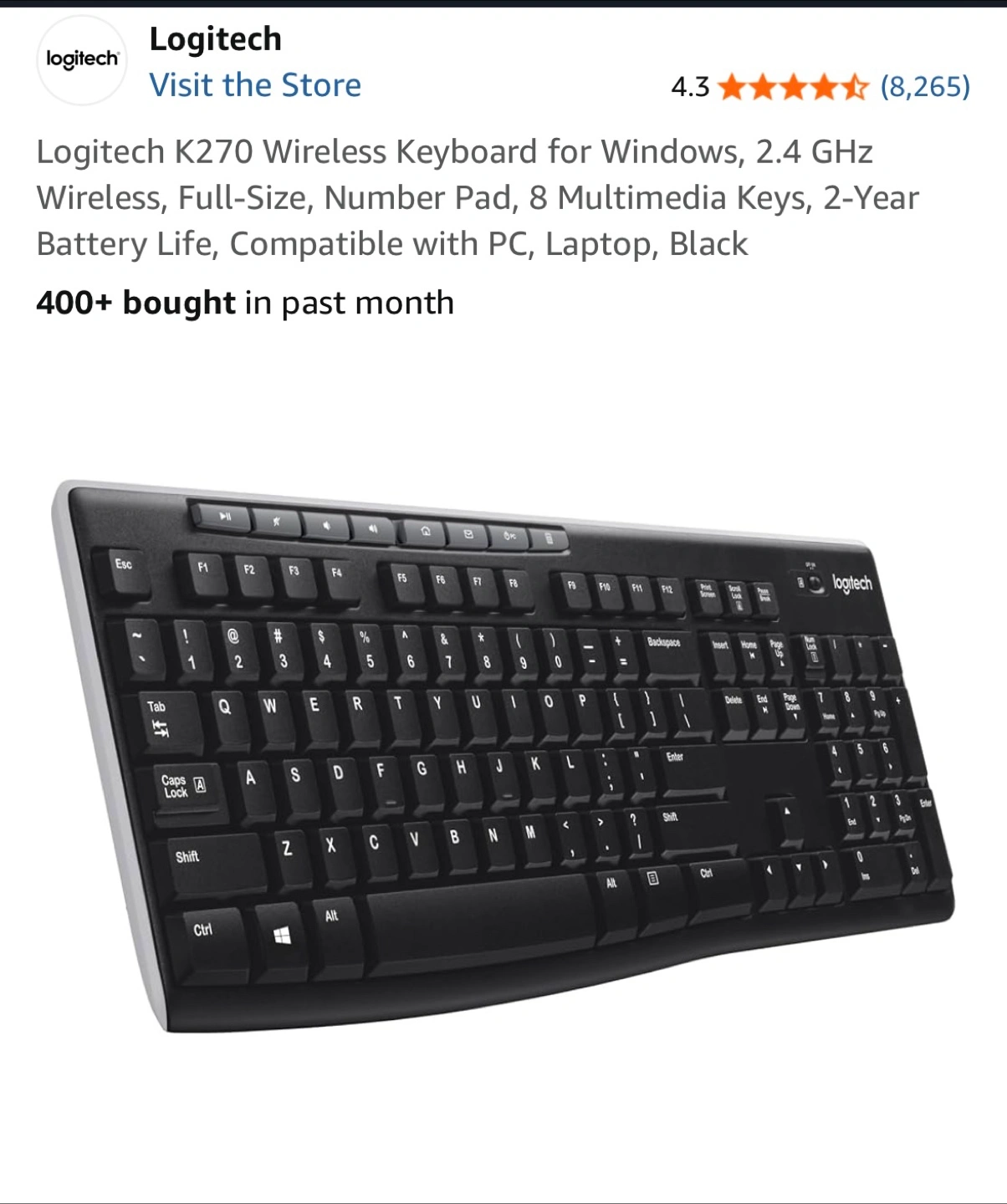 Selling a Logitech K270 wireless keyboard in black. It's a full-size keyboard with a number pad and 8 multimedia keys. It's compatible with PC and laptop and has a 2.4 GHz wireless connection. Originally bought for $29.99!