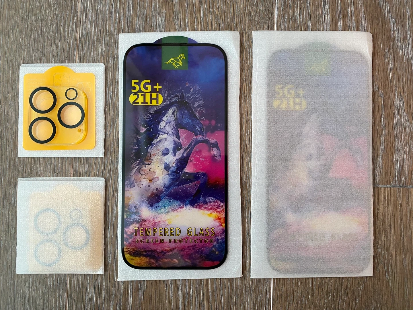 Tempered glass screen protector for 5G+ 21H. Includes screen protector, camera lens protector, and installation kit. Tempered glass material.