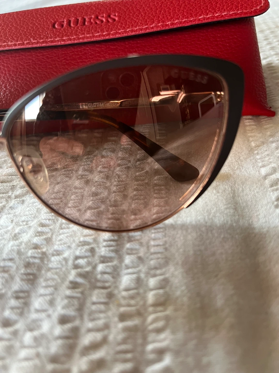 Cat-eye style Guess sunglasses in gold and tortoiseshell. Gradient brown lenses. Comes with a red faux-leather case. Model number GU7744 visible on inner arm.