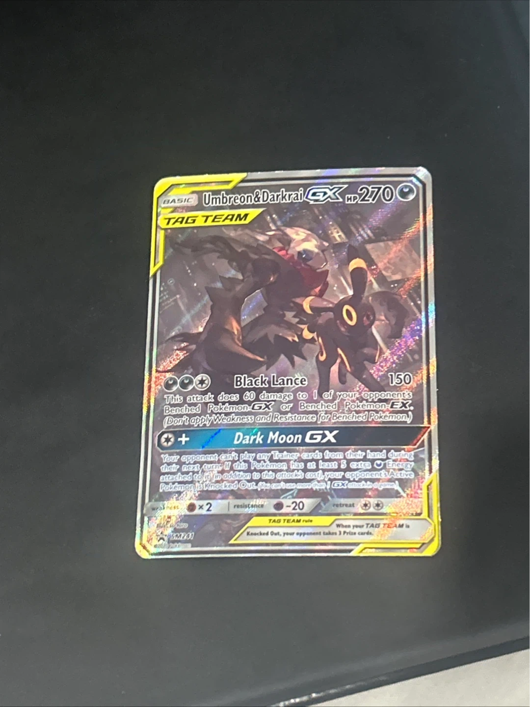 This is a Umbreon & Darkrai GX TAG TEAM Pokémon card. It has 270 HP and the 'Dark Moon GX' attack. The card has a 'Black Lance' attack that does 60 damage.