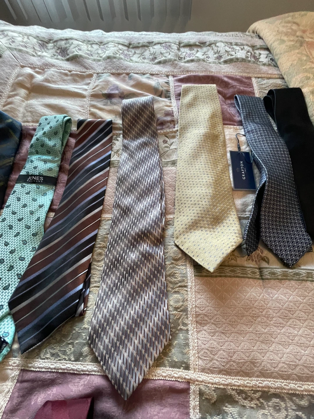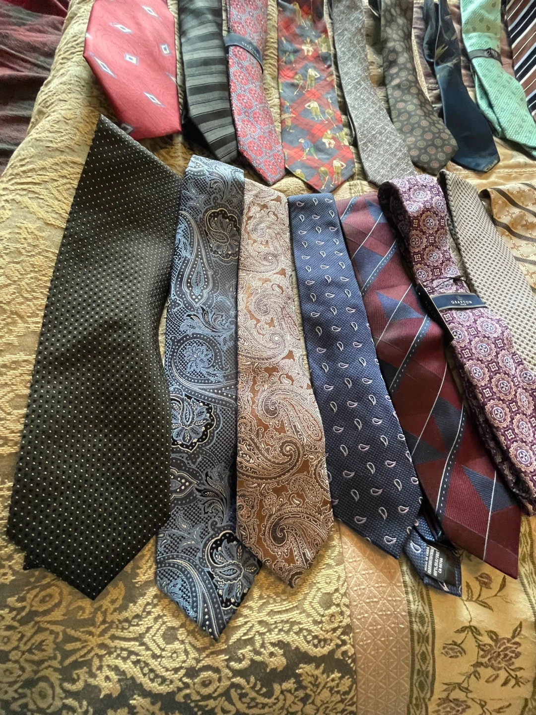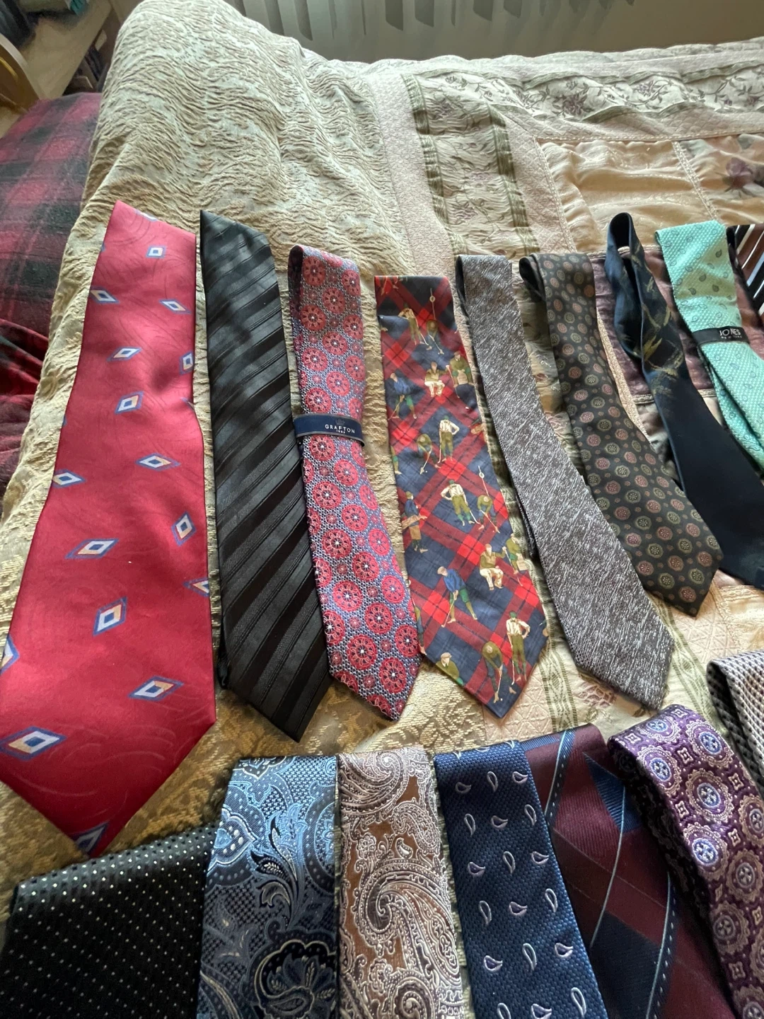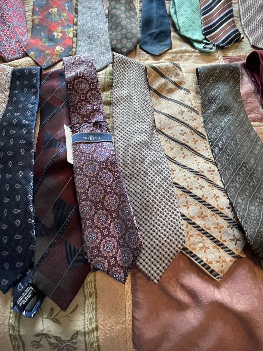 A collection of various men's neck ties with different patterns and colours. Features brands like Jones New York and Grafton. Materials include silk and polyester blends most never been used or only worn 1 time don’t wear ties anymore looking for a new home have 34 ties $20 dollars each there’s no size cash only please no e-transfers thank you