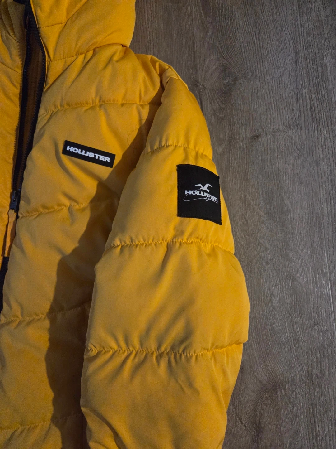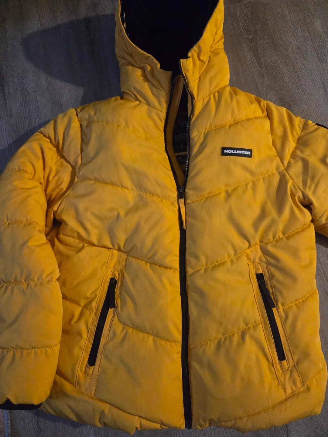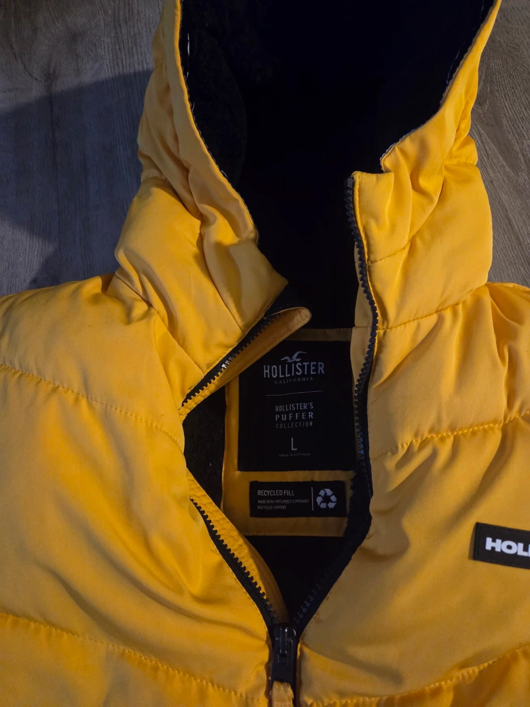 Hollister's puffer collection jacket in a bright yellow. It's a size large and features a recycled fill. Zippered pockets keep your belongings secure.