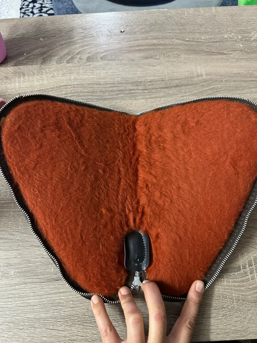 This is a faux leather pistol holster in a rich brown colour. It features a zipper closure and a soft, plush interior lining. Its shape is designed to hold a handgun securely.