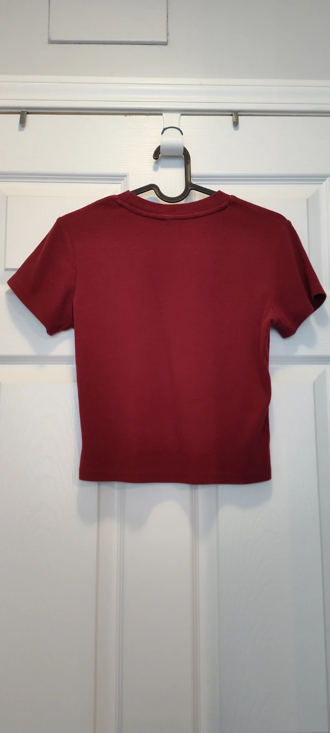 This maroon cropped t-shirt is made of a soft cotton blend. It's a size small with short sleeves and a classic crew neck. A simple staple for any casual outfit!