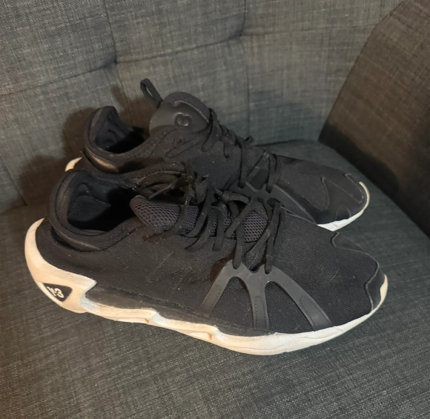 Selling a pair of Y-3 sneakers in black. They show some signs of wear on the soles, but the upper part is still in good condition. Please see the photos for details!