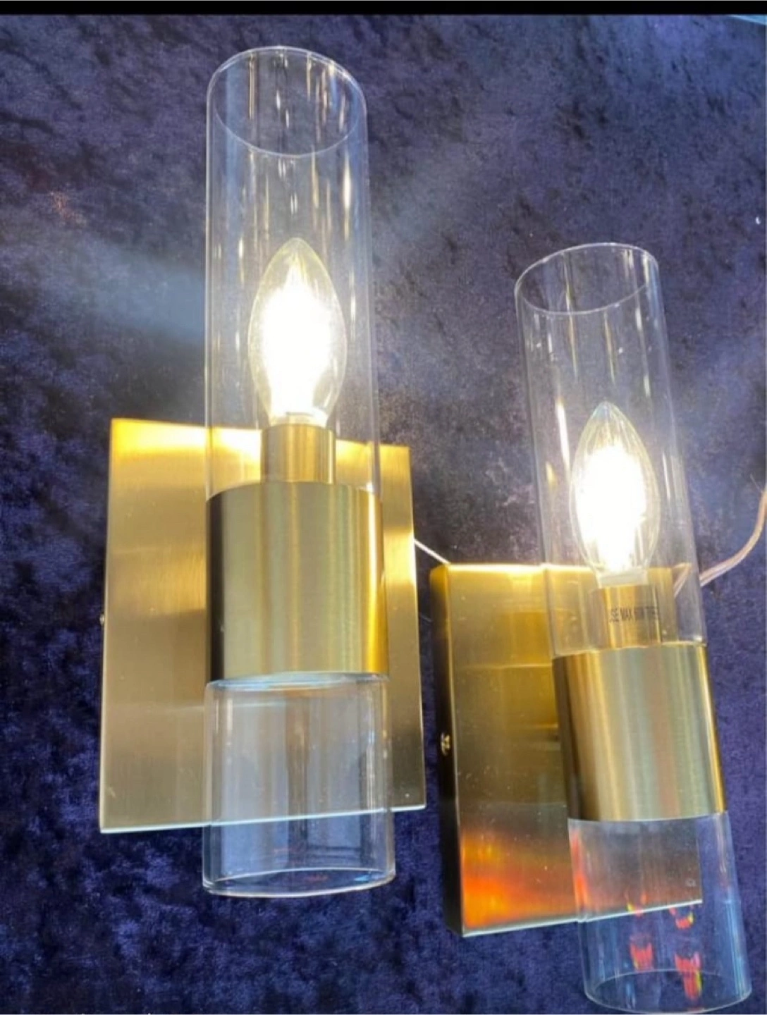 Selling a set of two stylish wall sconce lighting fixtures! They feature a sleek design with a gold-tone metal base and clear glass cylinder shades. These sconces would add a touch of modern elegance to any room