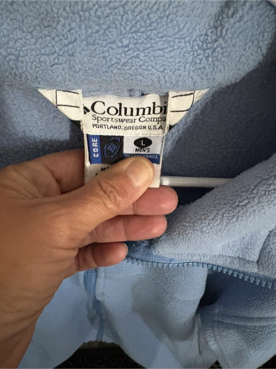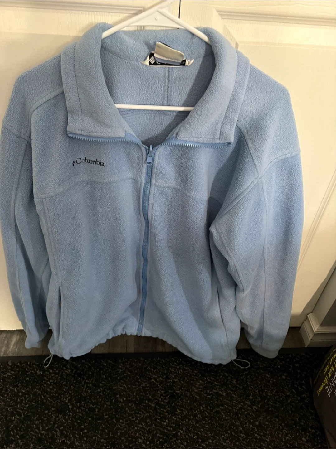 Light blue Columbia fleece jacket. Men's size large. Made of polyester material for warmth. It's great for layering on cooler days! Has draw strong sides of you like a more fitted look