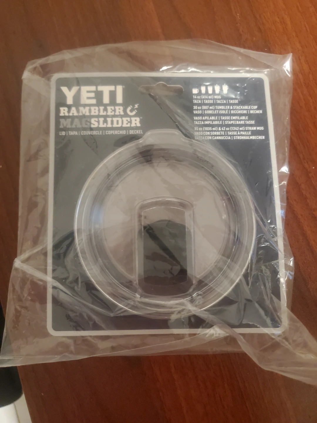 This is a Yeti MagSlider lid for Rambler drinkware. It's compatible with 14 oz mugs, 30 oz tumblers, and 35 oz & 42 oz straw mugs. The lid features a magnetic slider for easy opening and closing. Never used, still in packaging.