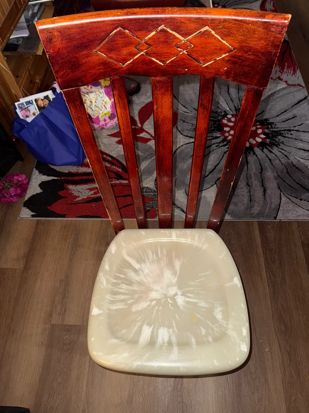 This is a wooden dining chair with a cushioned seat. The wood has a dark cherry finish. The seat is upholstered in a light cream or beige marble with a swirled pattern. It has a slatted backrest with decorative diamond shapes at the top. A solid, functional chair for any dining room or kitchen.