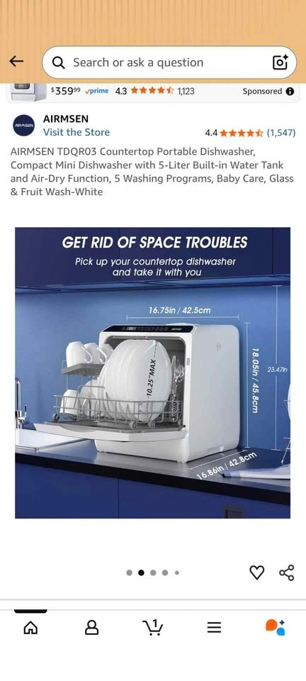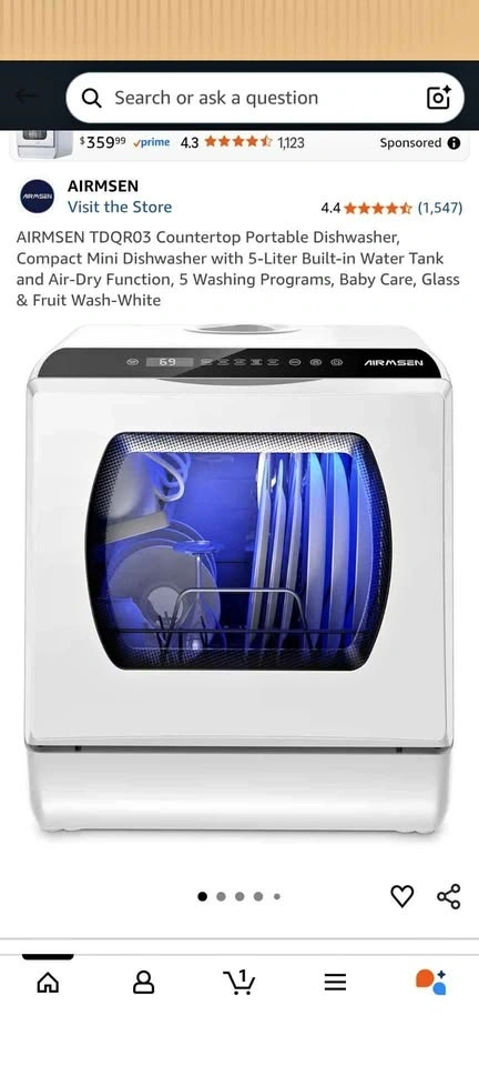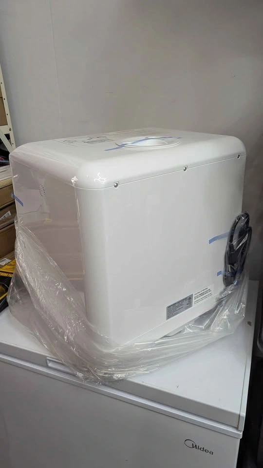 Brand new, still factory sealed. Compact AIRMSEN TDQR03 countertop dishwasher. This mini portable unit has a 5-liter built-in water tank and an air-dry function. It has 5 washing programs including baby care, glass, and fruit wash. White color. Dimensions are about 16.75in wide, 18.05in high, and 16.86in deep. Fits dishes up to 10.25in tall.