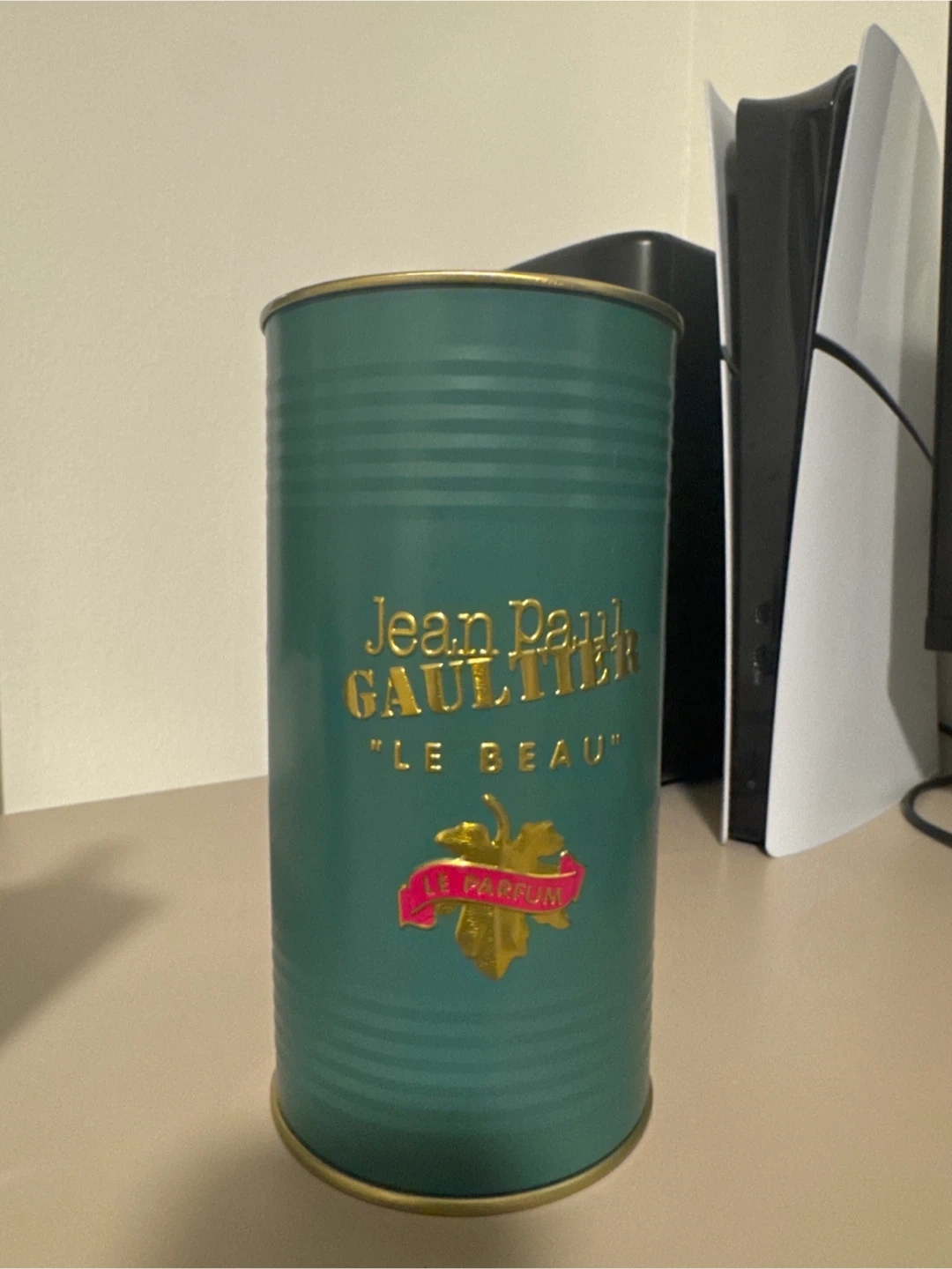 This is the Jean Paul Gaultier "Le Beau" Le Parfum. It comes in a unique bottle shaped like a torso and includes its original green tin packaging. It's a fragrance for men.