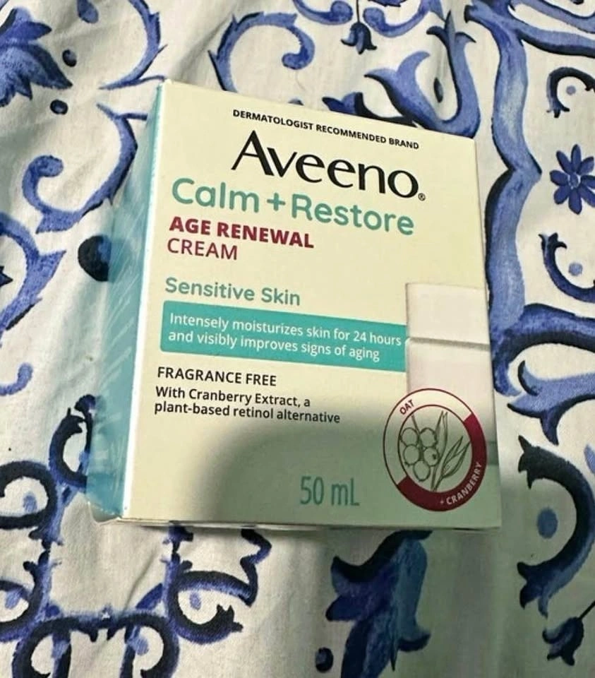 Aveeno Calm + Restore Age Renewal Cream 50ml container. It's a fragrance-free formula with Cranberry Extract, a plant-based retinol alternative. It intensely moisturizes skin for 24 hours and visibly improves signs of aging. This cream is new, never opened. Never used. Retails for $39+tax. Asking $35.