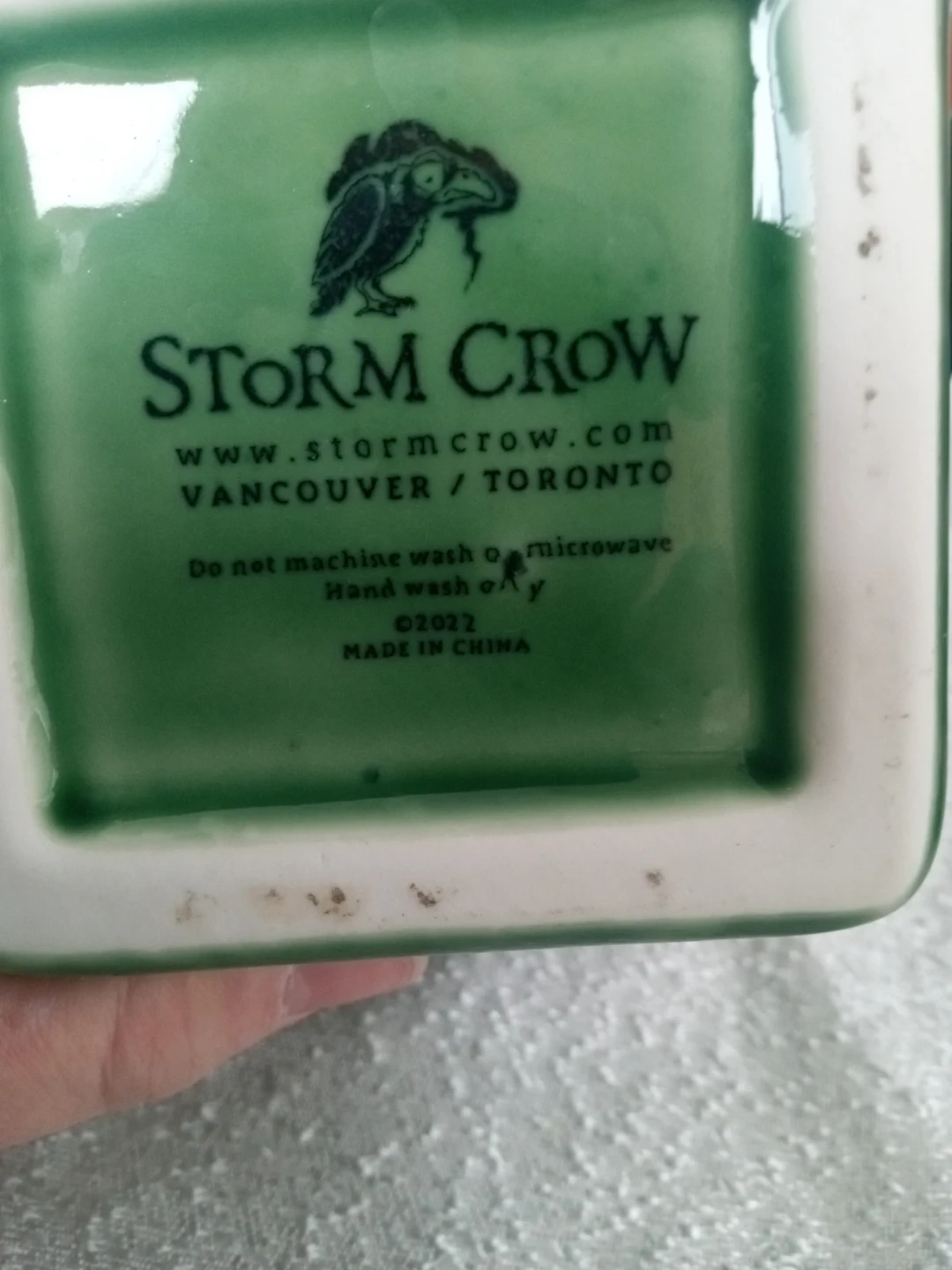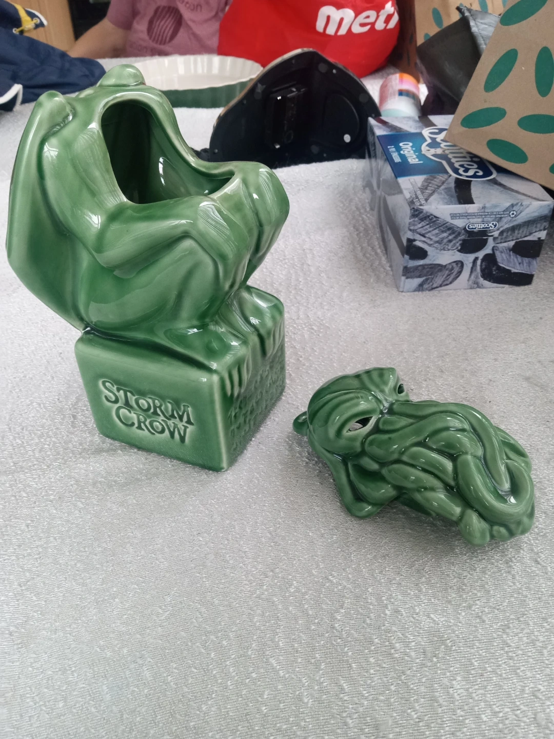 This green ceramic tiki mug features a Cthulhu design with a removable lid. It's from Storm Crow and measures approximately 7 inches tall. Hand wash only; do not machine wash or microwave.