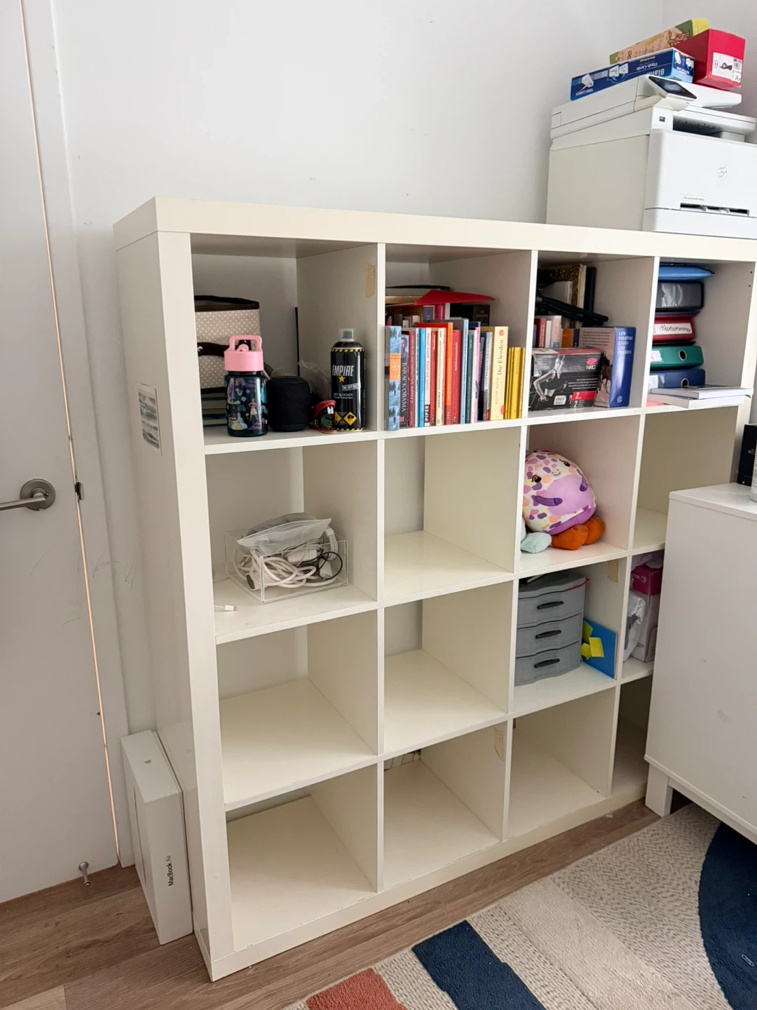 This is a white cube shelf unit with 16 cubbies from Ikea (Kallax). It's perfect for storing books, decor, or other household items.
