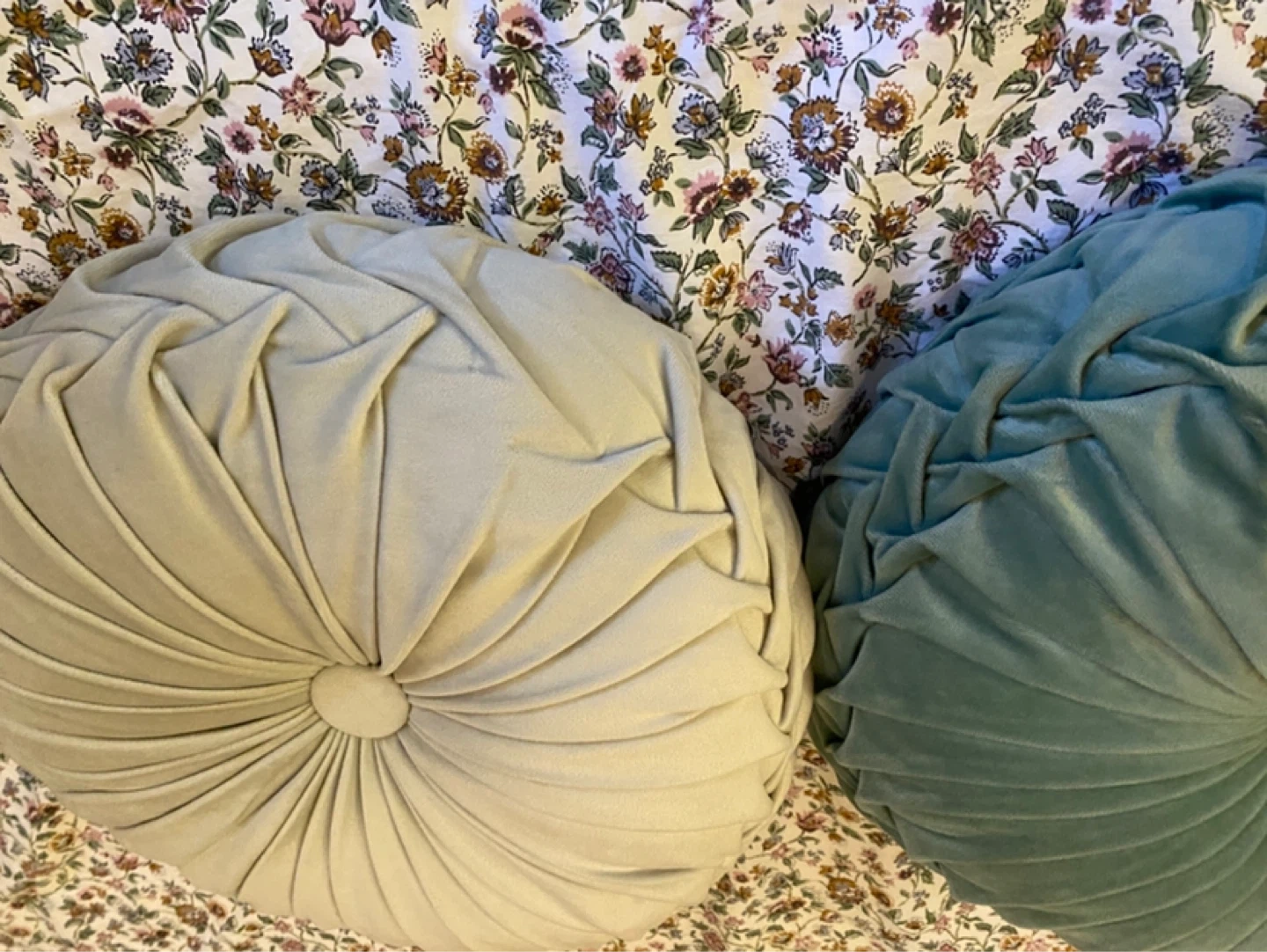 Set of 2 Pleated Round Throw Pillows - light grey & teal