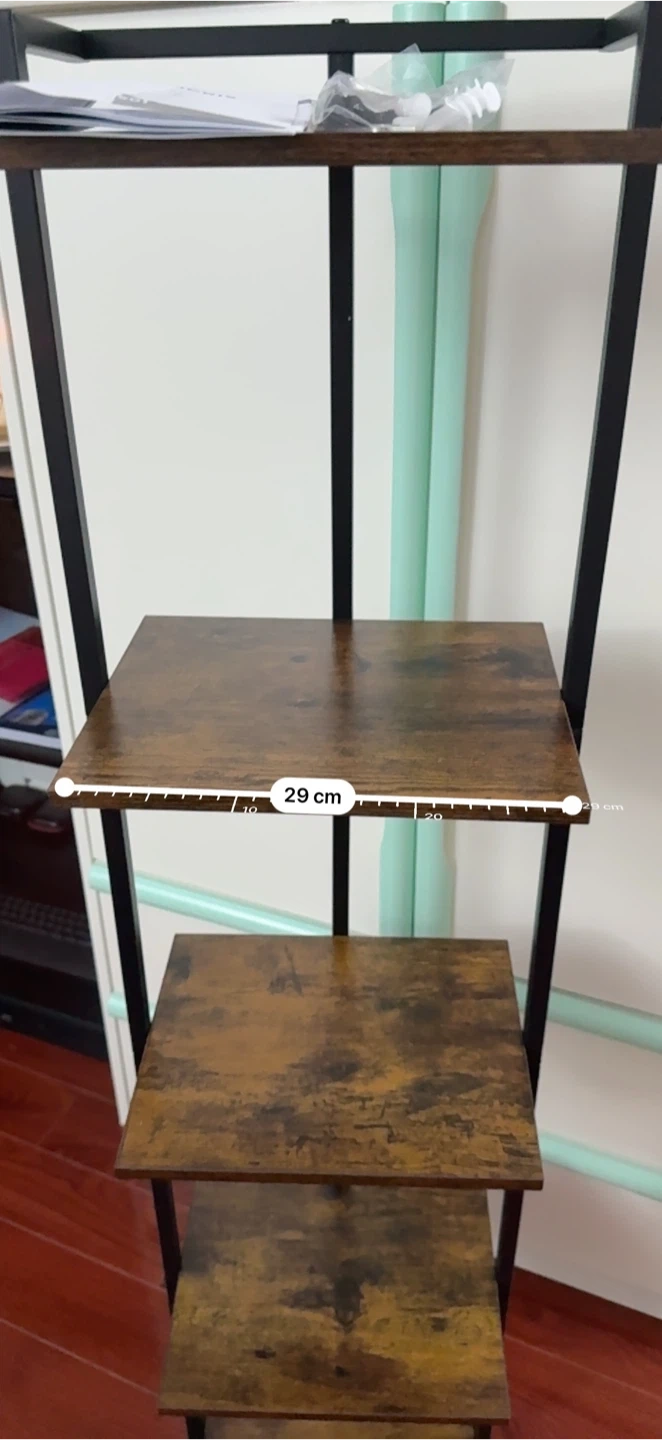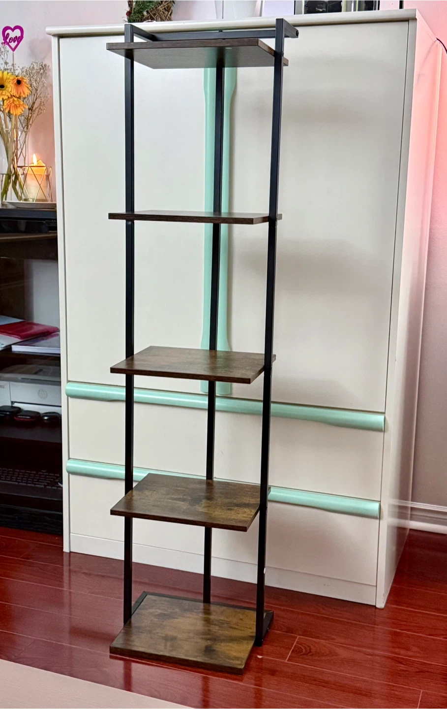 This bookshelf has a rustic wood grain finish with a black metal frame. It's 1.52m tall with 5 shelves, each shelf being 29cm deep. It's perfect for displaying books or decor!