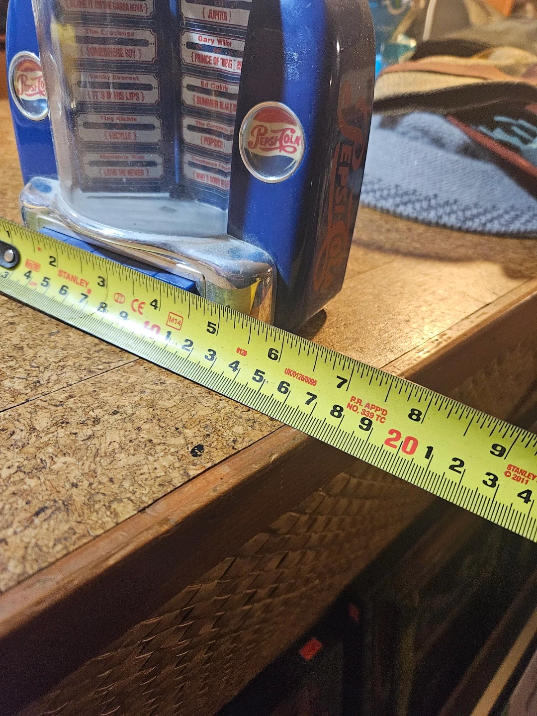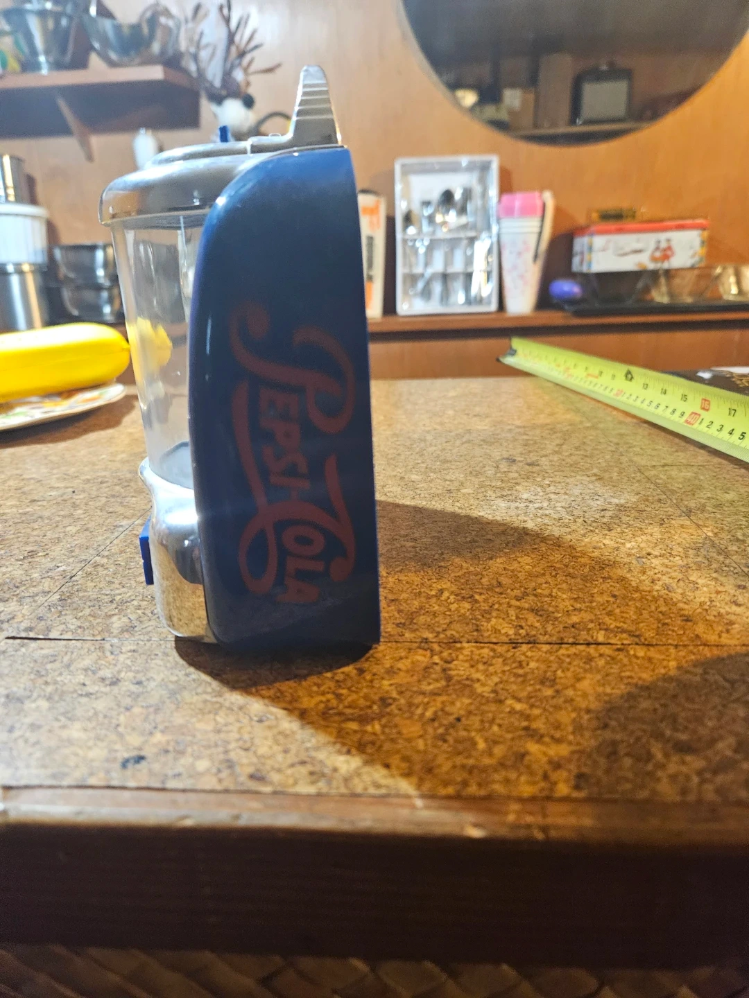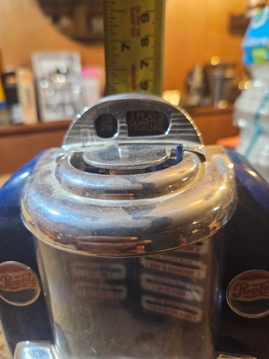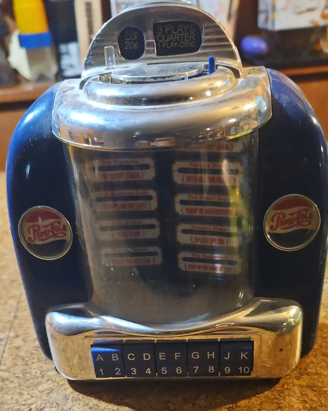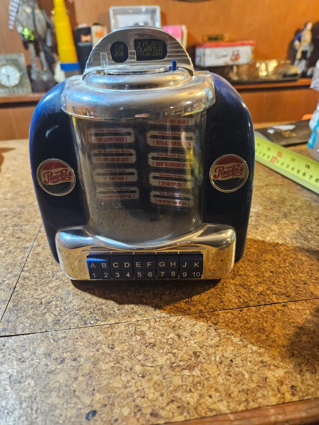 This is a fun Pepsi Cola themed coin bank shaped like a miniature jukebox. It accepts 10¢ or 25¢ coins, allowing 3 plays per quarter or dime. A great novelty item for collectors or fans of vintage-style memorabilia!