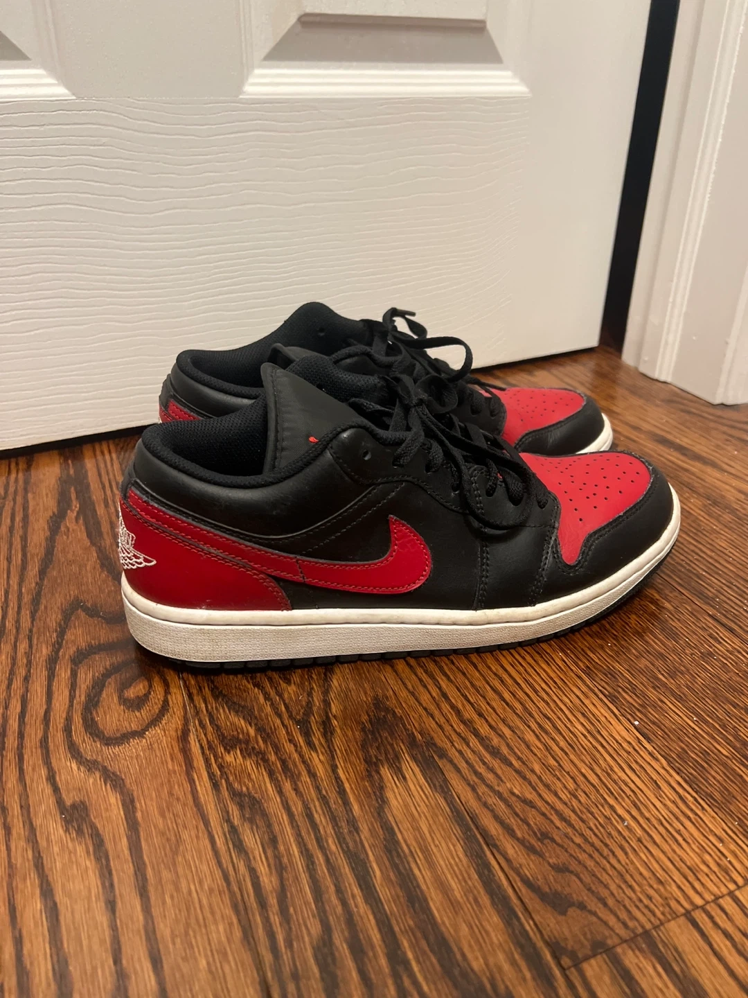 These are Air Jordan 1 Low Reverse Bred sneakers in black and red. Size US 9, EUR 42.5, BR 40.5. Made in Indonesia.
