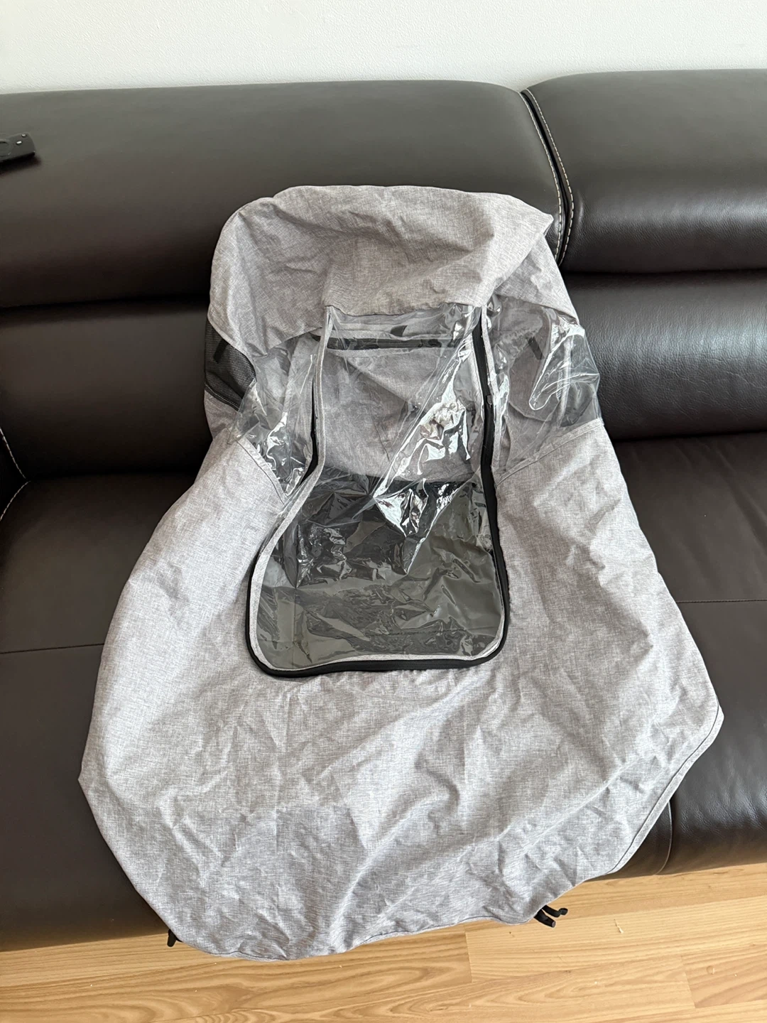 This stroller rain cover is a handy accessory for keeping your little one dry on the go. It's made of durable grey fabric and features a clear window for visibility. It has fasteners to secure it to the stroller. Great for rainy or windy days!